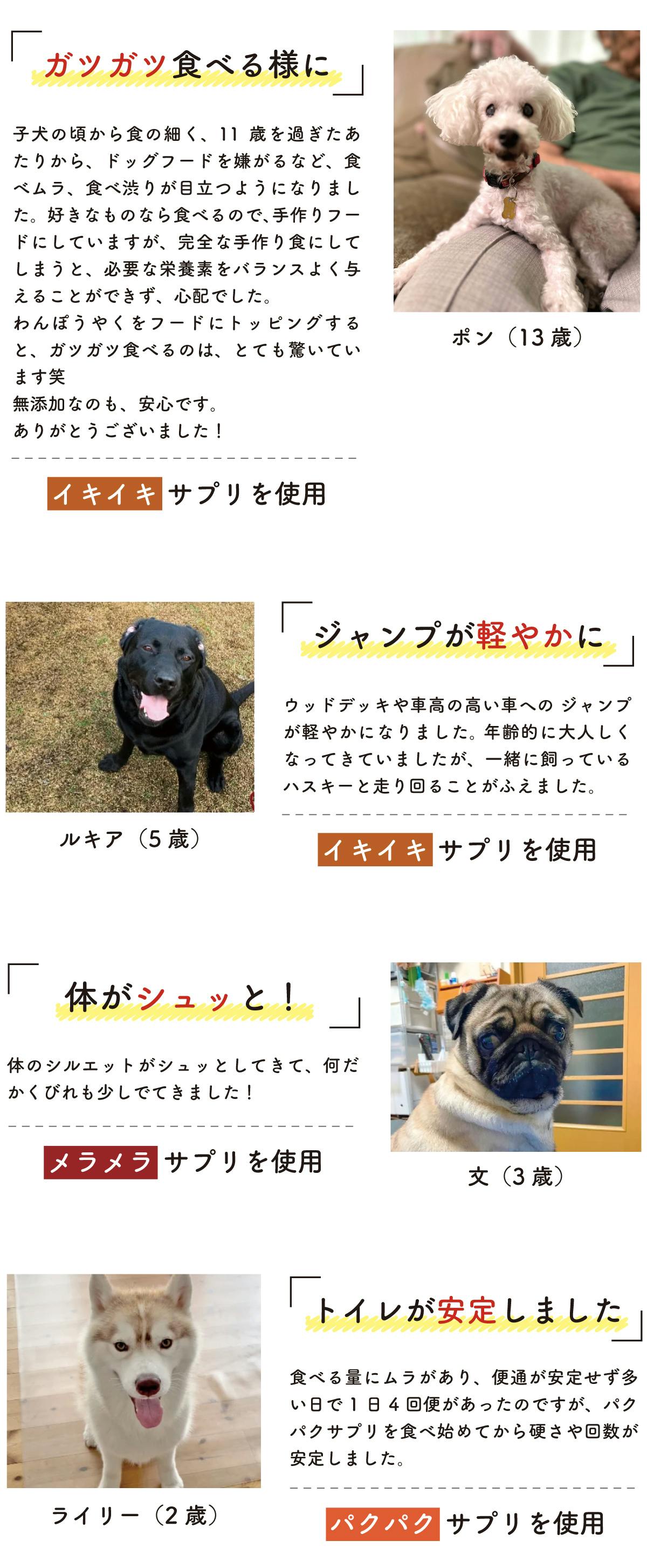 開発にあたり、実際にわんぽうやくをご使用いただいたみなさまのお声をピックアップいたしました。ご協力いただきありがとうございました。