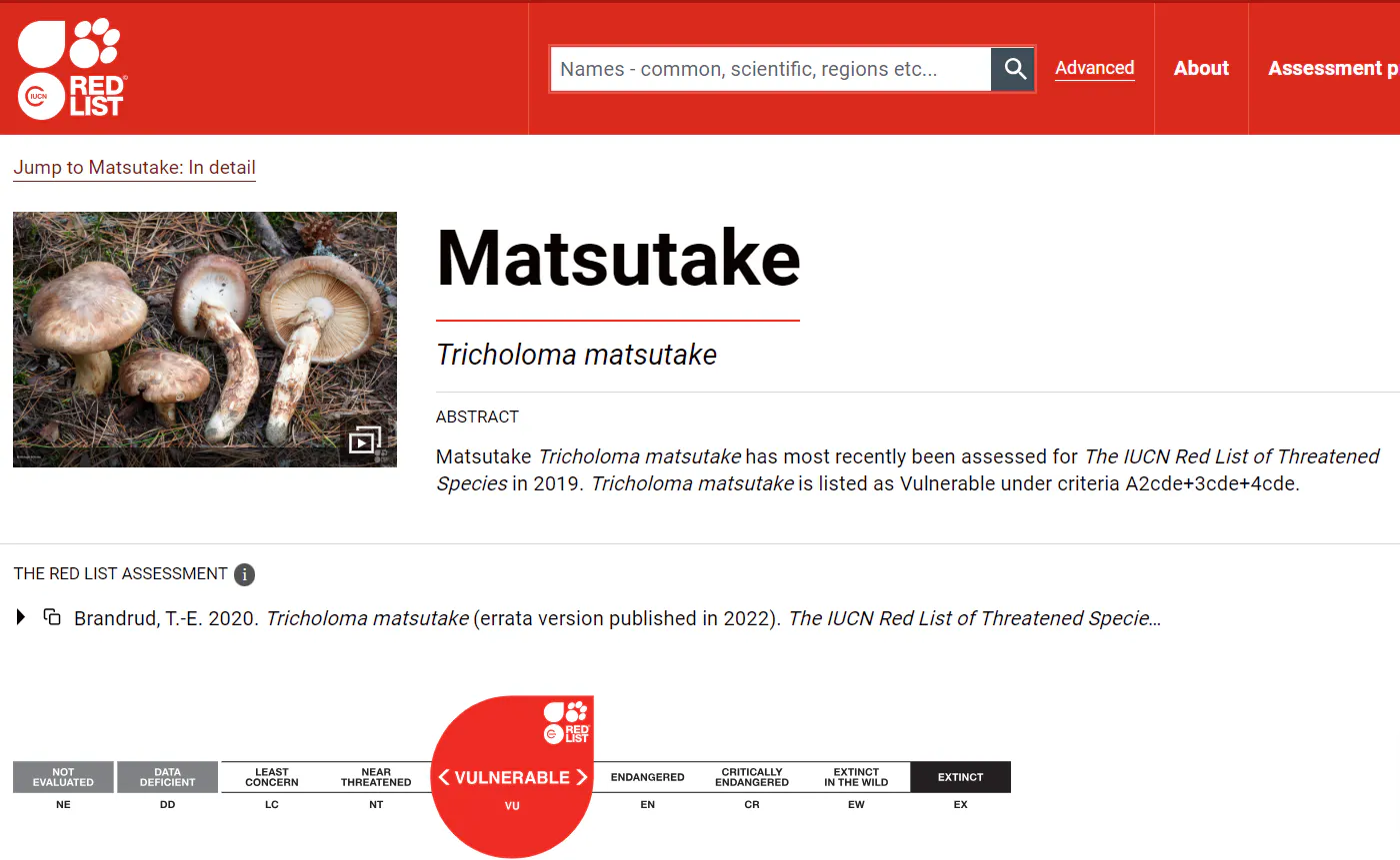 2020年7月から、まつたけは、スイスに本部があるIUCN(国際自然保護連合)でも「レッドリスト」に“危急(VU)”として掲載されるようになり、「絶滅危惧種」とされる危機的な状況にあるのです。