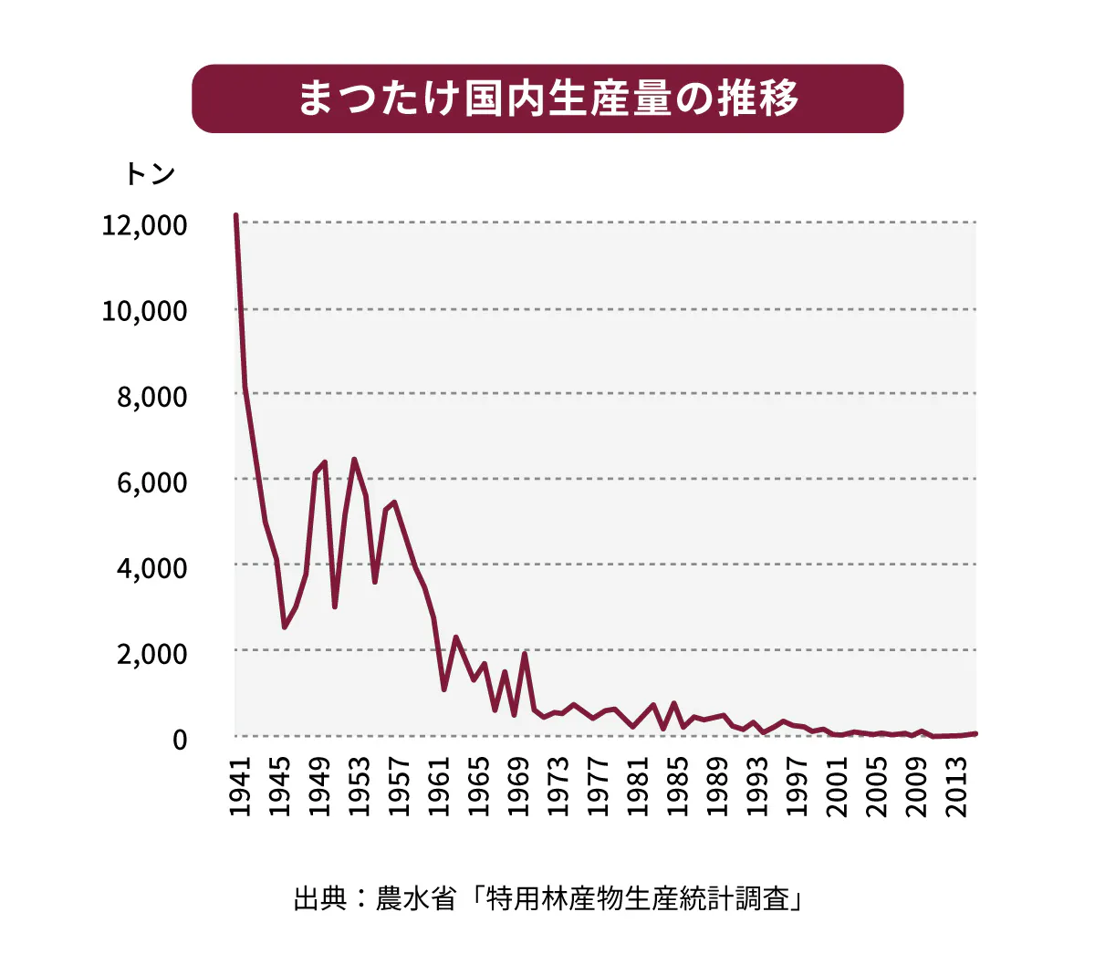 ところが、その企画を進める中で、国産のまつたけの生産量は、1941年には1万2000トンでしたが、1950年頃までに約半減、さらに1960年代も激減が続き、令和4年はわずか36トンで戦前の0.3%程度となってしまっているということを知りました。