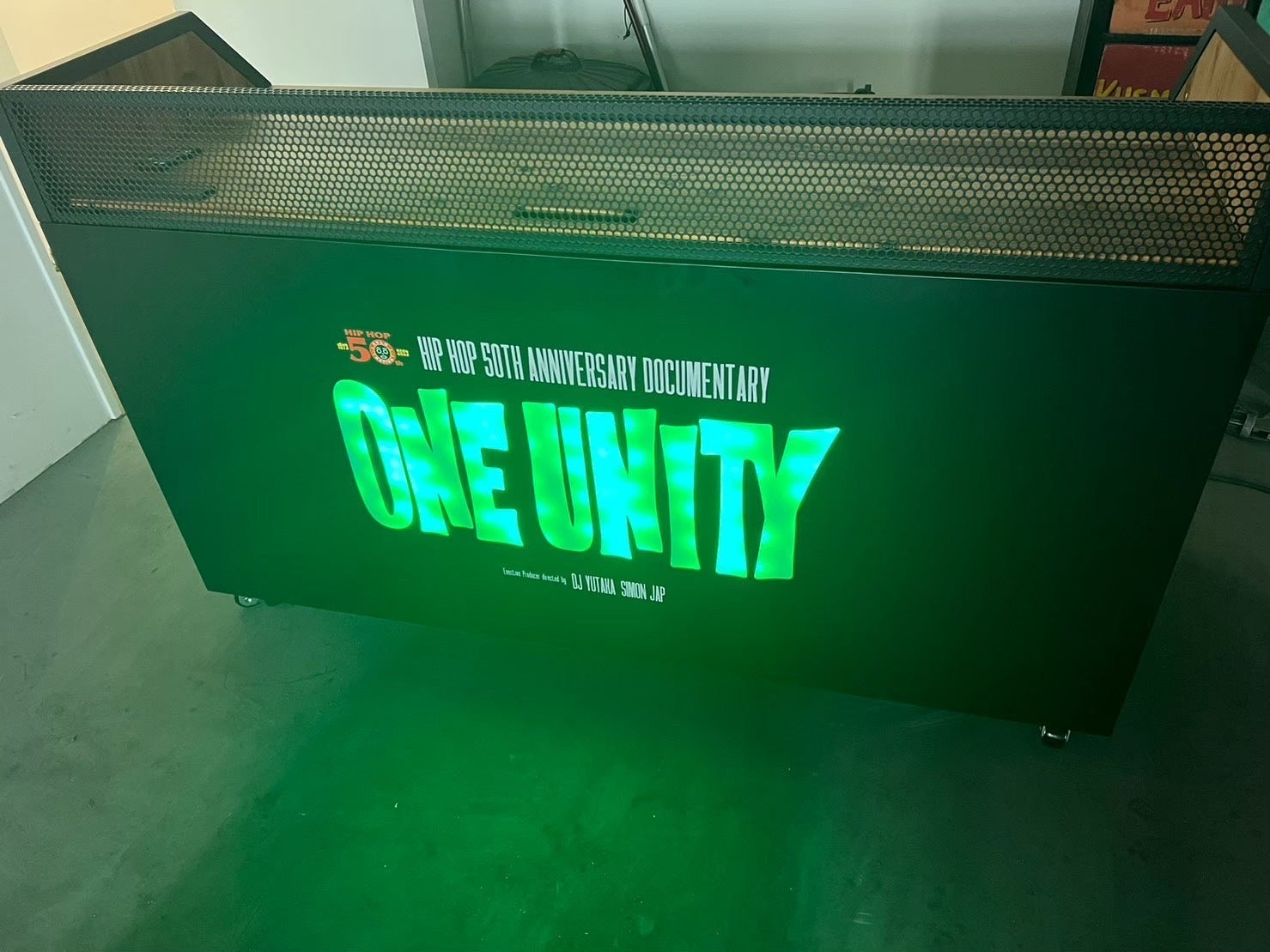 折り畳み式"ONE UNITY"オリジナルDJブースをセットし、Hip Hopには欠かせない重低音が響き渡るスピーカーから爆音を鳴らし、各地を代表するDJ、MC、ブレイカー、ライターを招き、地元のお店などにも出店して頂き、日本全国各地のHip Hopを愛する皆さんと、その街の皆さんで、Hip Hopのルーツから現在・未来繋がる街おこし的な放映会イベントを開催する事が楽しみで仕方ありません!!