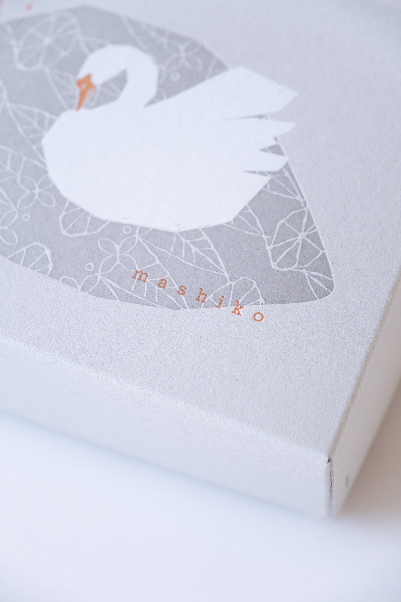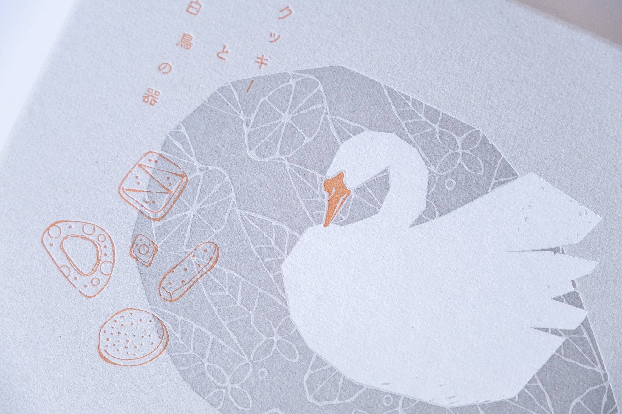 白鳥はホワイトの箔押しで白さを強く、文字部分とクッキーはオレンジ、背景の模様(器の底面の柄を表現しています)はグレーの活版印刷を使っています。