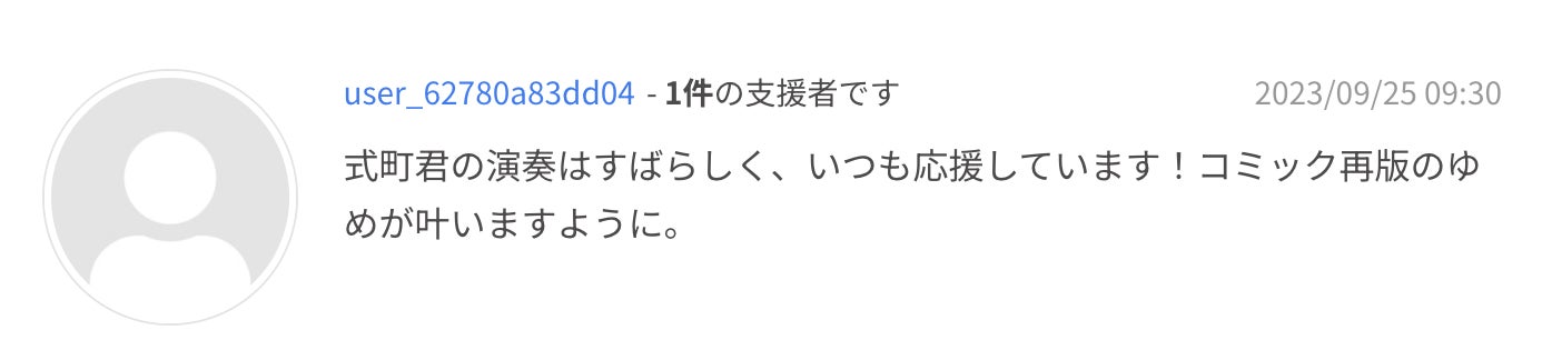 このように紆余曲折しているところなのですが、先ほど、「式町水晶の演奏会を開催する権利(限定3名)」のリターンのご支援をいただきました!
