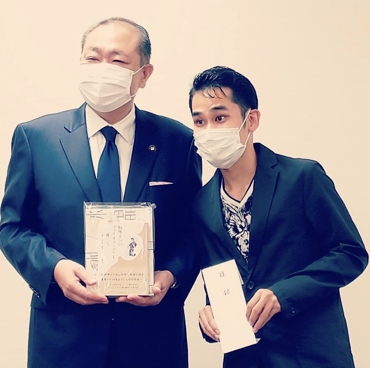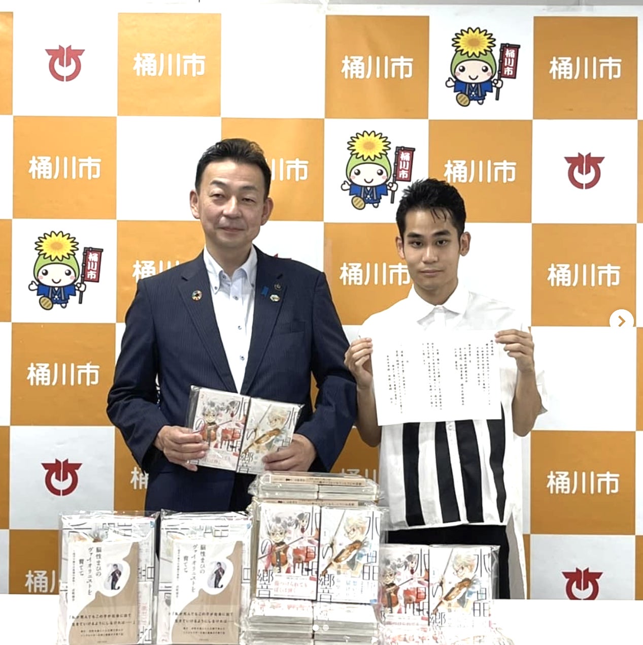 2021年9月 桶川市長と。市立の全小中学校に図書を寄贈。