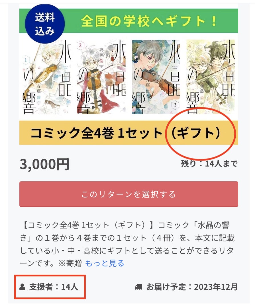 "脳性まひ"の障がい、いじめ・不登校、母子家庭の環境からメジャーデビューまでの式町水晶を描いていただいているコミック「水晶の響」を小・中・高校にギフトとして送ることができるリターンをご用意しているのですが、「14人」からご支援をいただいています!賛同いただき、本当にありがとうございます!