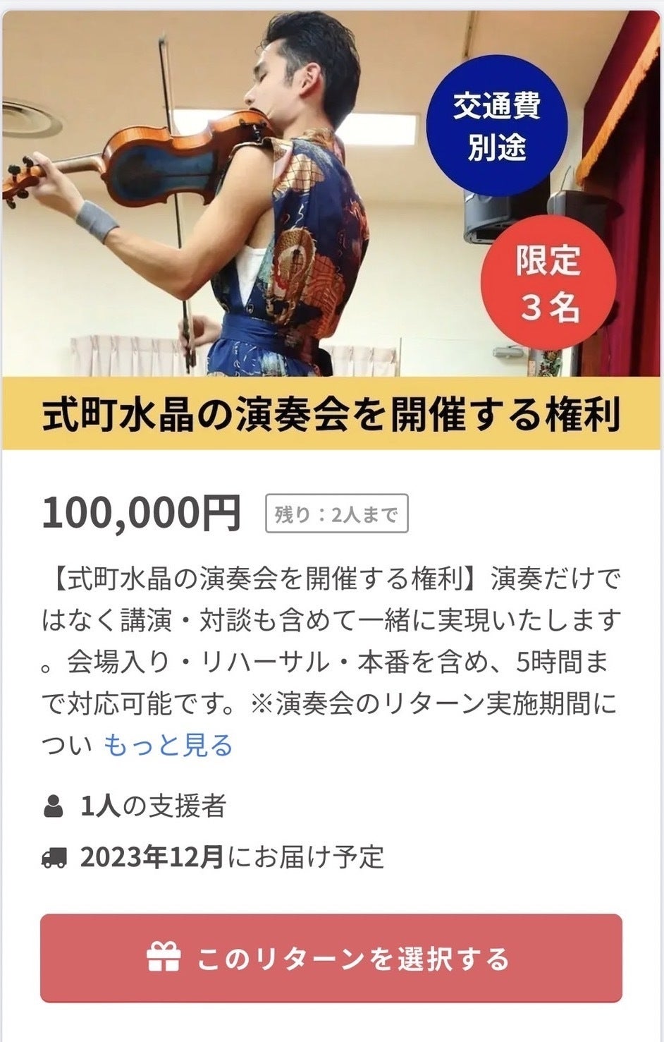 このように紆余曲折しているところなのですが、先ほど、「式町水晶の演奏会を開催する権利(限定3名)」のリターンのご支援をいただきました!