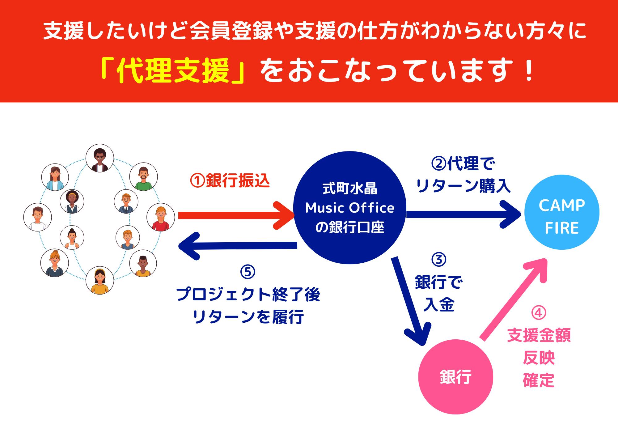 これは、式町水晶Music Officeの銀行口座宛にお振込みをいただき、こちらで支援手続きを代行し、クラウドファンディングに反映させる方法です。