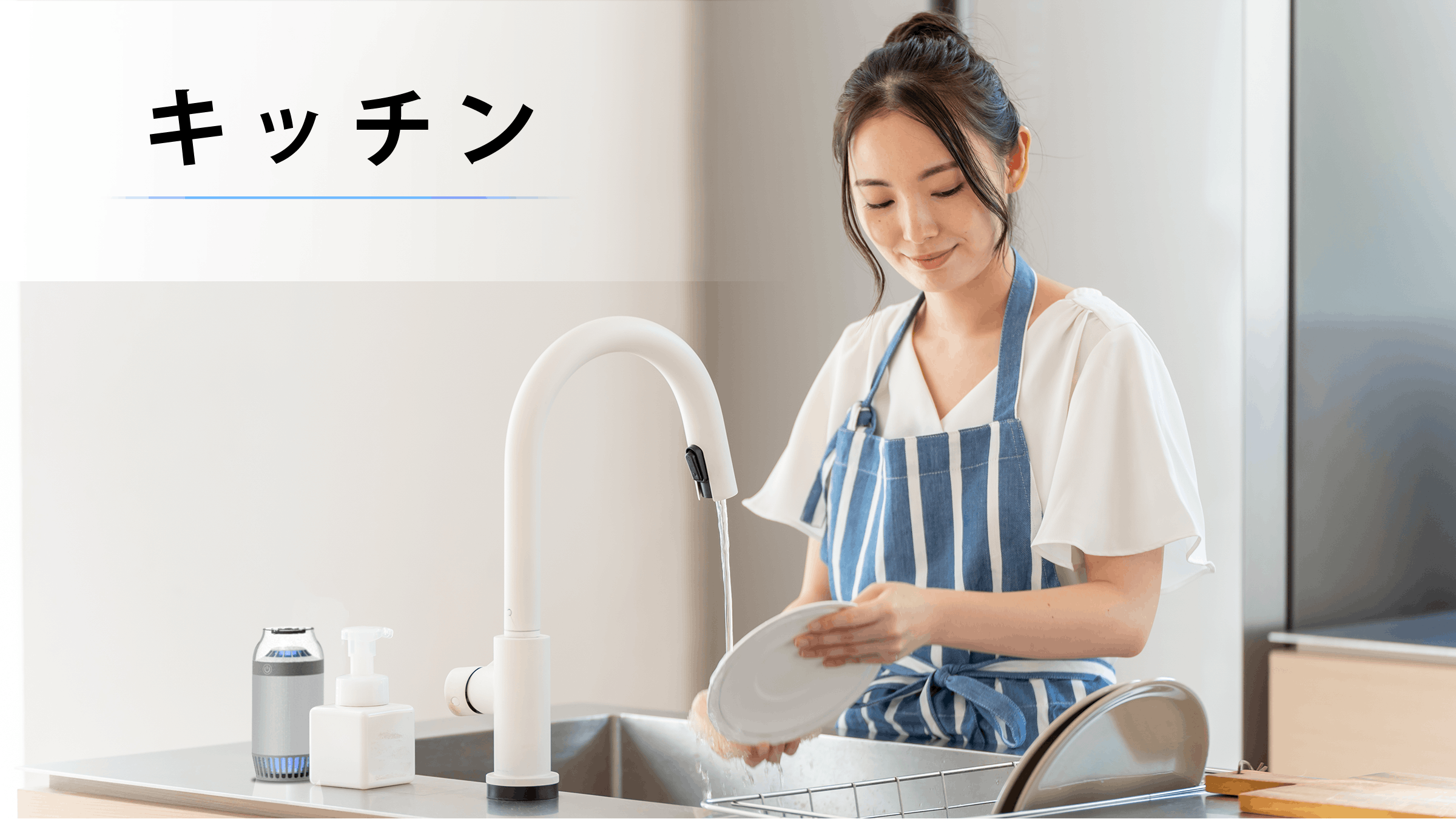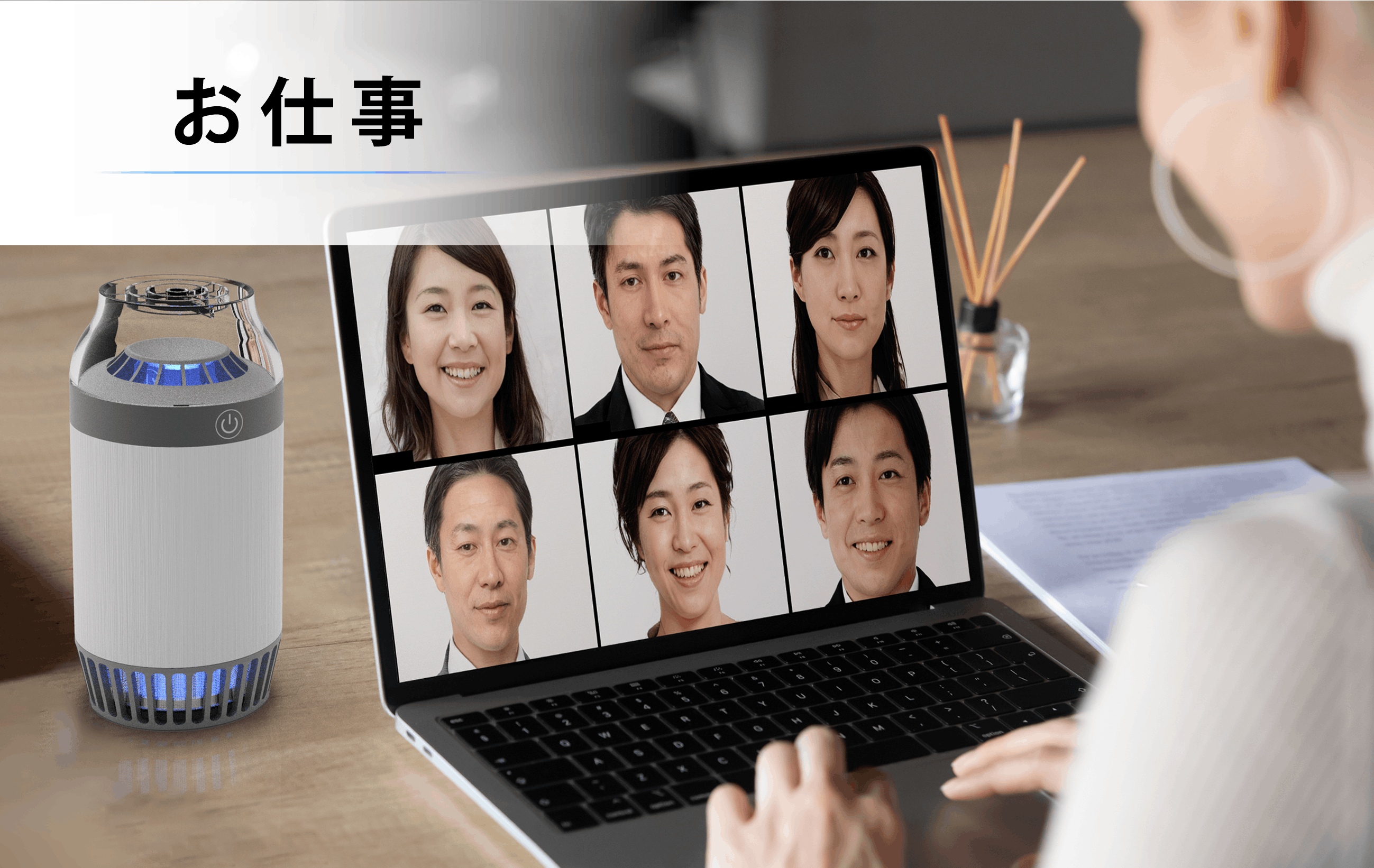 また、バッテリー可動なのでコンセントの場所など関係なく、トイレやキッチン、会社のデスクなどの狭い場所にも使用していただけます。(満充電で2時間使用可能)