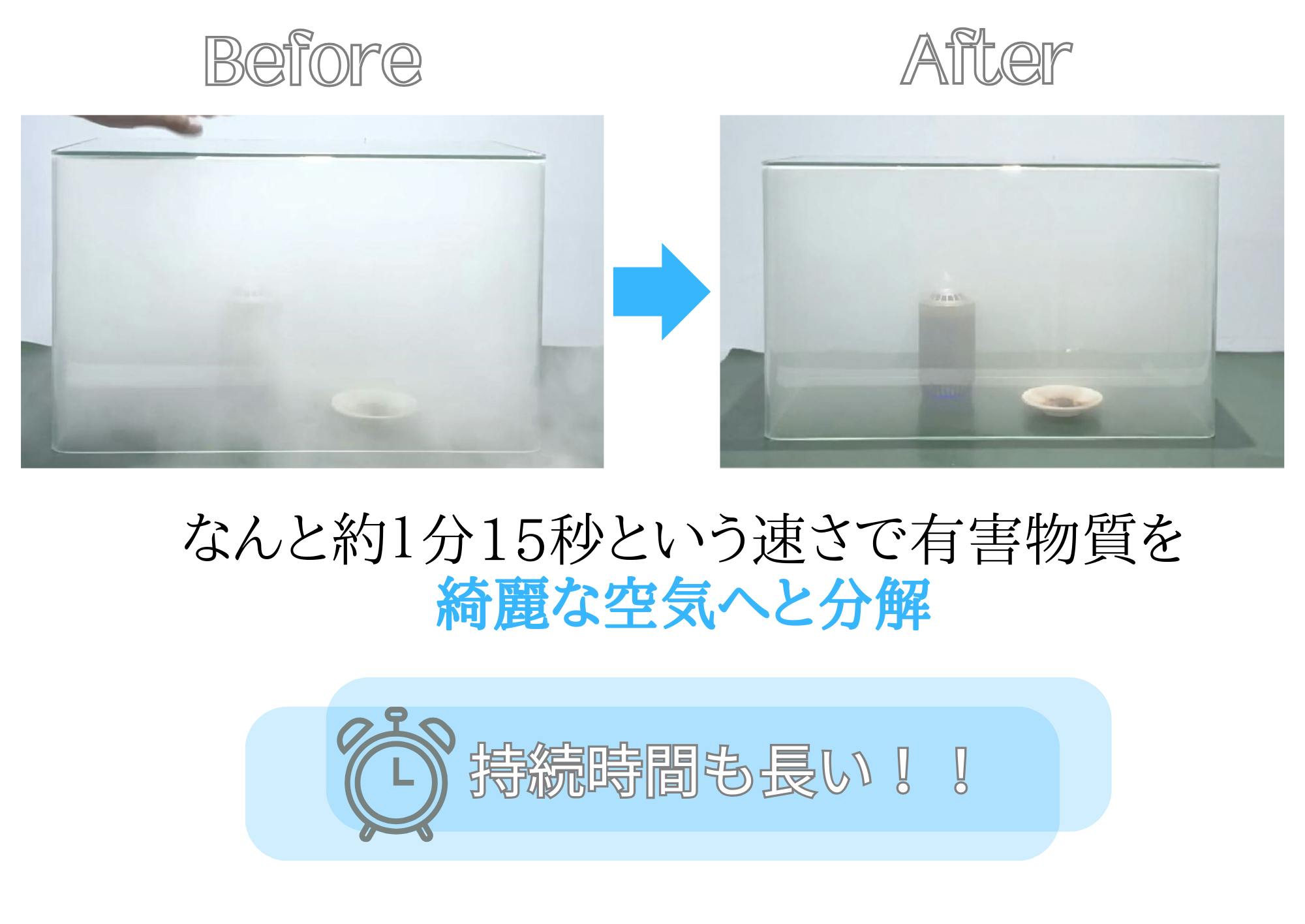 上記のグラフを見てお分かりいただけるように、この空気除菌脱臭機を使用することによって、有害物質が10分もかからずに分解され綺麗な空気へと変わっています。