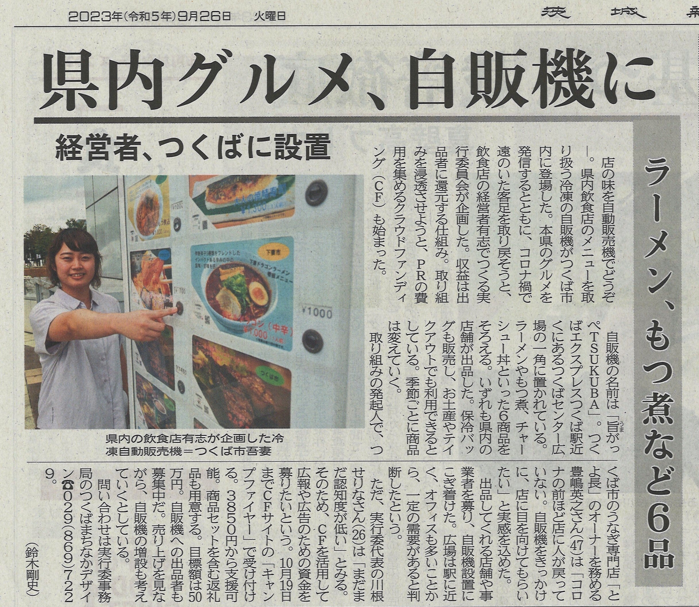 2023/10/20 00:00たくさんのご支援をいただき、ほんとうに本当にありがとうございました♪今はまだ小さな発信場所ですが、みなさまの暖かいお気持ちをパワーに変え、いばらきの美味しいものをもっともっと発掘し発信していきたいと思います!目的は、『いばらきの玄関口TSUKUBAより、いばらきの美味しいものを発信』ですので、これからも美味しいものは当然のこと、ワクワクさや、時にはマニアックさなども発信できる楽しい発信場所にしていきたいと思います。そして、「いばらきの物は旨がっぺね!」っと全国の方から言っていただけるような発信場所の自動販売機に育んでいければと思っております。これからもぜひ、応援よろしくお願いいたします。旨がっぺ実行委員会 もっと見る私たちの取り組みが茨城新聞に掲載されました!