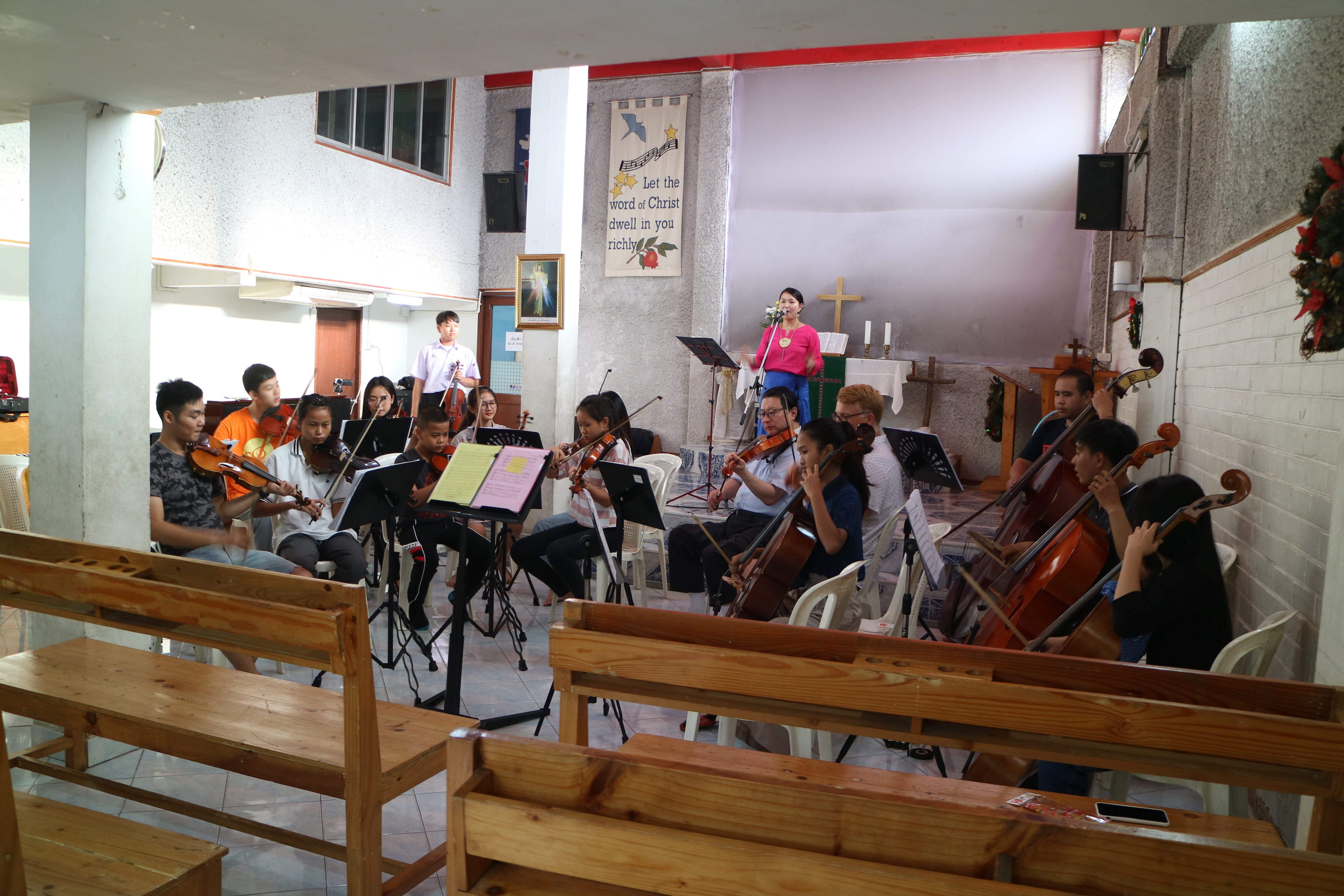 しかし2000年、そのスラム街で子供たちを集め、無料で楽器の演奏を教えたノルウェーの宣教師がいました。日本人音楽家とリハーサルをする子供たち バンコク最大のスラム「クロントイ・スラム」にある小さな教会で始まった子供たちのオーケストラ。