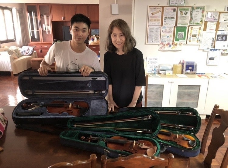寄付された楽器を受け取るトンさん(左)と