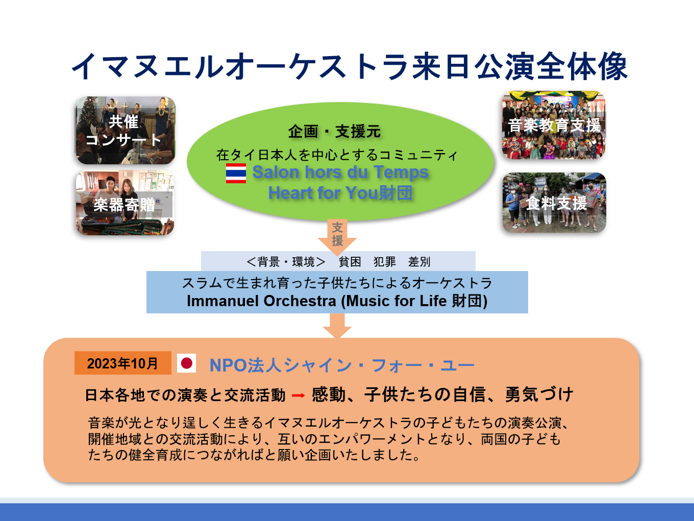 อยากสร้างรอยยิ้มให้เด็กๆ กับการแสดง วงออเคสตราที่ญี่ปุ่น ของเด็กที่เกิดในชุมชนคลองเตยกรุงเทพ! "ชุมชน หรือ สลัมคลองเตย" ในกรุงเทพฯ เมืองหลวงของประเทศไทย ได้รับการขนานนามว่าเป็น "แหล่งรวมอาชญากรรมและการค้ายาเสพติด" และเป็นสถานที่ที่คนในพื้นที่มักจะหลีกเลี่ยง แต่แล้วในปี 2000 มิชชันนารีชาวนอร์เวย์ได้รวบรวมเด็กๆ ในชุมชนและสอนให้พวกเขาเล่นเครื่องดนตรีฟรี ซึ่งเริ่มต้นจากโบสถ์เล็กๆ วงออเคสตราสำหรับเด็ก "อิมานูเอล ออร์เคสตรา" ในปัจจุบัน ได้ทำให้เด็กๆ เป้าหมายในการแสดงต่อหน้าผู้คน และมีความภูมิใจในตนเองว่า "ฉันมีประโยชน์ต่อผู้อื่น" และได้ป้องกันการเข้าสู่วงการอาชญากรรมและยาเสพติด ด้วยเหตุนี้ วงออเคสตรานี้จึงถูกเรียกว่า “ปาฏิหาริย์แห่งสลัม” ปัจจุบัน ภัยพิบัติโคโรนาได้จบลงแล้ว ทำให้สามารถเดินทางระหว่างประเทศไทยและต่างประเทศได้ จึงมีการวางแผนทัวร์ของ Immanuel Orchestra ไปยังญี่ปุ่น เพื่อนำดาวรุ่งแห่งสลัมมาสู่ญี่ปุ่น ขอขอบคุณสำหรับการสนับสนุนในการทำให้สิ่งนี้เป็นจริง