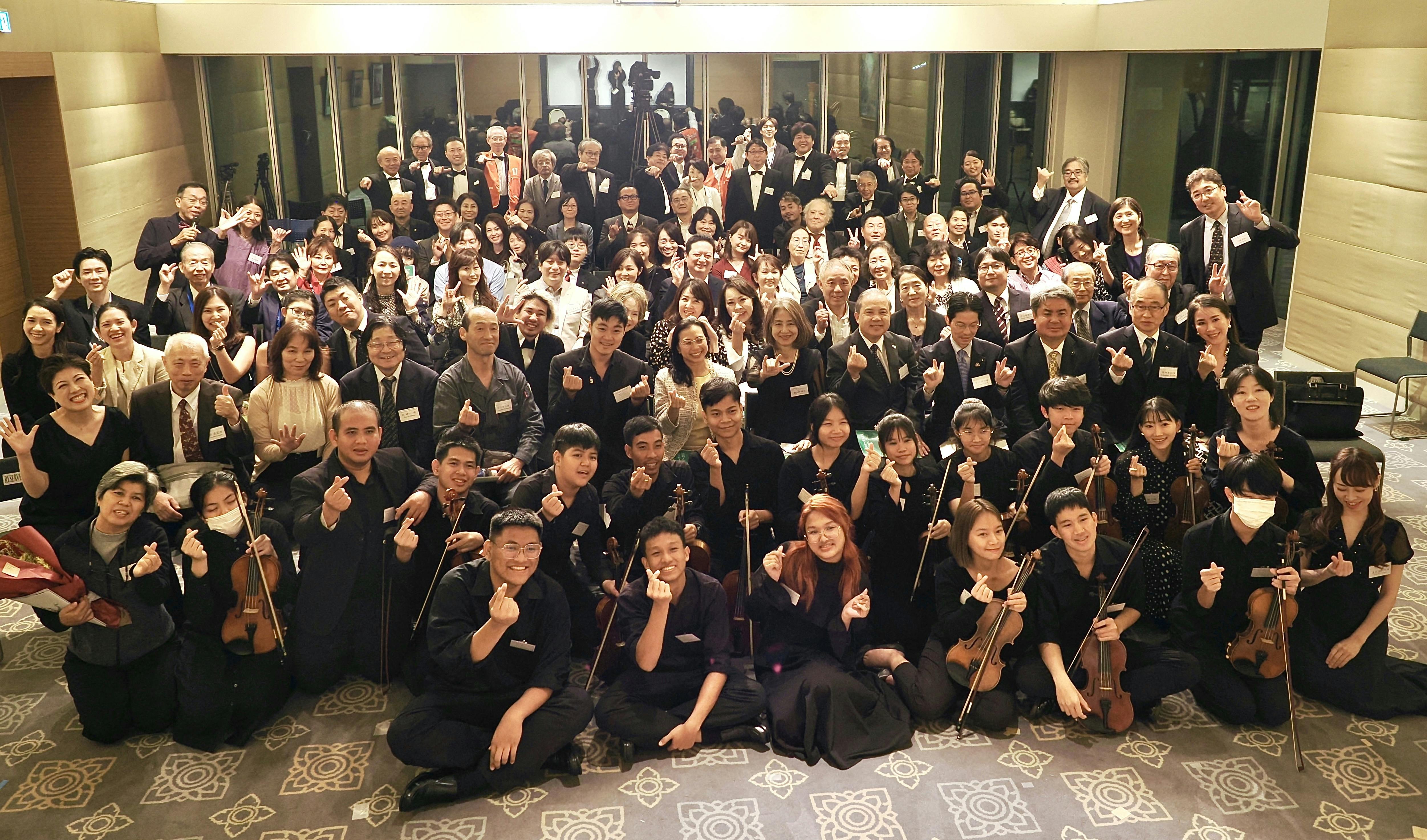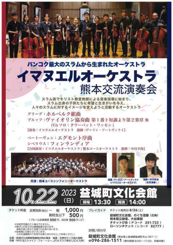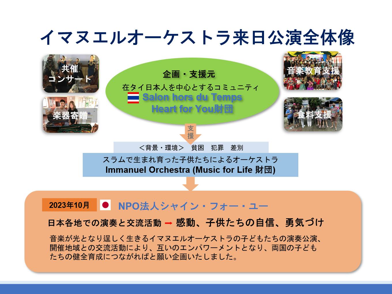 2023/10/23 15:16各地で「満員御礼」 イマヌエルオーケストラ日本縦断ツアーが大成功で終了!バンコク「スラムの奇跡」イマヌエルオーケストラが10月12日に来日してから、怒涛の12日間が過ぎていきました。 ①北海道公演(10月15日、北海道音更町「音更町文化センター」) ②在東京タイ王国大使館特別公演「感謝の夕べ」(10月18日、スポンサー企業等が対象) ③東京公演(10月19日、東京都新宿区「日本福音ルーテル教会」) ④熊本公演(10月22日、熊本県益城町「益城町文化会館」) ――が開催されました! (少人数のスタッフで駆け回っていたため、ご報告が遅くなりました。お詫び申し上げます) マスメディアにも多く取り上げられたおかげもあり、北海道公演は600人の観客を集めて、ほぼ満席。東京公演は200席余が完売、熊本公演で用意した約500席も完売となりました! みなさまのご支援に改めて感謝いたします。ありがとうございました。 以下に、各公演のハイライトをFacebookにある「NPO法人シャイン・フォー・ユー」ページや「イマヌエルオーケストラ来日公演応援グループ」、また各種メディアで公開された記事・ニュースなどのリンクを貼って紹介してまいります。◎同年代の子供たちと友情が芽生えた北海道公演 1人あたり30kgもの荷物を抱えて札幌・新千歳空港から日本入りを果たしたイマヌエルオーケストラの子供たち(中・高校生13人、指導者4人、引率者1人の計18人)は、まず北海道の音更(おとふけ)町で宿泊。 ここで15日に開かれた「おとふけ生涯学習フェス2023音楽祭」で、来日して初めての演奏会を開きました。 その演奏の様子はこちらから。→北海道公演・全記録 そして、音更町は特撮映画『ゴジラ』シリーズで有名な作曲家、故・伊福部昭の故郷でもあります。昔から音楽が盛んな地で「音更町 伊福部昭記念 ジュニアオーケストラ」もあります。また中学校・高校でも吹奏楽部などが多く存在します。 そんな地元の小・中・高校生と共演も果たしました。総勢80人で構成し、管楽器も打楽器も入ったオーケストラで演奏したのは、SF交響ファンタジー第1番より『ゴジラのテーマ』(青山昌弘編曲)です。 そしてアンコールでは、タイでも人気の漫画・アニメ「ドラえもん」の曲『夢をかなえてドラえもん』を演奏しました。 指揮者は北海道のジュニアオーケストラ活動の第一人者で、「どさんこ青少年オーケストラ協会」の代表・音楽監督を務める助乗慎一さん。非常に迫力のある演奏になりました。 これは聴き逃せません!→ 圧巻の演奏◎初めて訪れた“海外にある自国の大使館”で「感謝の夕べ」 北海道から東京へ移動したイマヌエルオーケストラは、18日(水)の18時30分から、東京都品川区にある在東京タイ王国大使館(以下、タイ大使館)のホールで、スポンサー企業様などをお招きしての「感謝の夕べ」を開きました。 タイ大使館からの全面的なバックアップで実現したこの公演。子供たちは初めて、海外にある自国の大使館を訪問することになりました。 10月から臨時代理大使を務めるプラーンティップ・ガーンジャンハッタキット公使ほかタイ大使館のスタッフの皆様、そして2023年9月末まで同大使館の前大使だったシントン・ラーピセートパン氏が帰任地のバンコクからわざわざお越しいただいて列席する中、ホールの定員100人を超えるお客様が集まりました。 タイ大使館にも当日のこの様子をFacebookページで紹介していただきました。 NPO法人シャイン・フォー・ユーのFacebookページでの投稿はこちら。 また、この大使館での公演「感謝の夕べ」の様子は、テレビ朝日系列のニュース番組でも報道されたほか、同じテレビ朝日の情報番組「大下容子ワイド!スクランブル」でも5分30秒ほども取り上げられました(動画はYouTubeから)。 ※なお、東京公演のフル動画も高音質・高品位映像でご用意しています! →ライブ配信用チケット「イマヌエルオーケストラ東京公演 with Tambun Project 」 (配信期間:2023年11月19日〜12月31日)ぜひお買い求めください。 https://tambun.theshop.jp/items/78579468◎感動の東京公演、最後はほぼ全員がスタンディングオベーション! そして19日(木)には、いよいよ東京での本公演「Tambun Project presents "Music with No Borders" with Immanuel Orchestra」が開かれました。「Tambun Project」は、駐在員の子息としてタイ・バンコクに住んで日本人学校に通っていた日本人女性3人が立ち上げた音楽プロジェクトです。ヴォーカル・新妻由佳子さん、ピアニスト・宮野寛子さん、コーディネーター・山形まどかさんの3人は「お世話になったタイへの恩返し」をプロジェクトのテーマとしており、これまでもイマヌエルオーケストラの本拠地であるクロントイ・スラムでも、一緒にコンサートを開いてきました。 会場は、東京・新宿に近い大久保通りにある日本福音ルーテル東京教会。奇しくも、イマヌエルオーケストラが発祥したクロントイ・スラムの教会と同じルーテル教会です。多くの訪日外国人観光客が通るこの地で、18時に開場