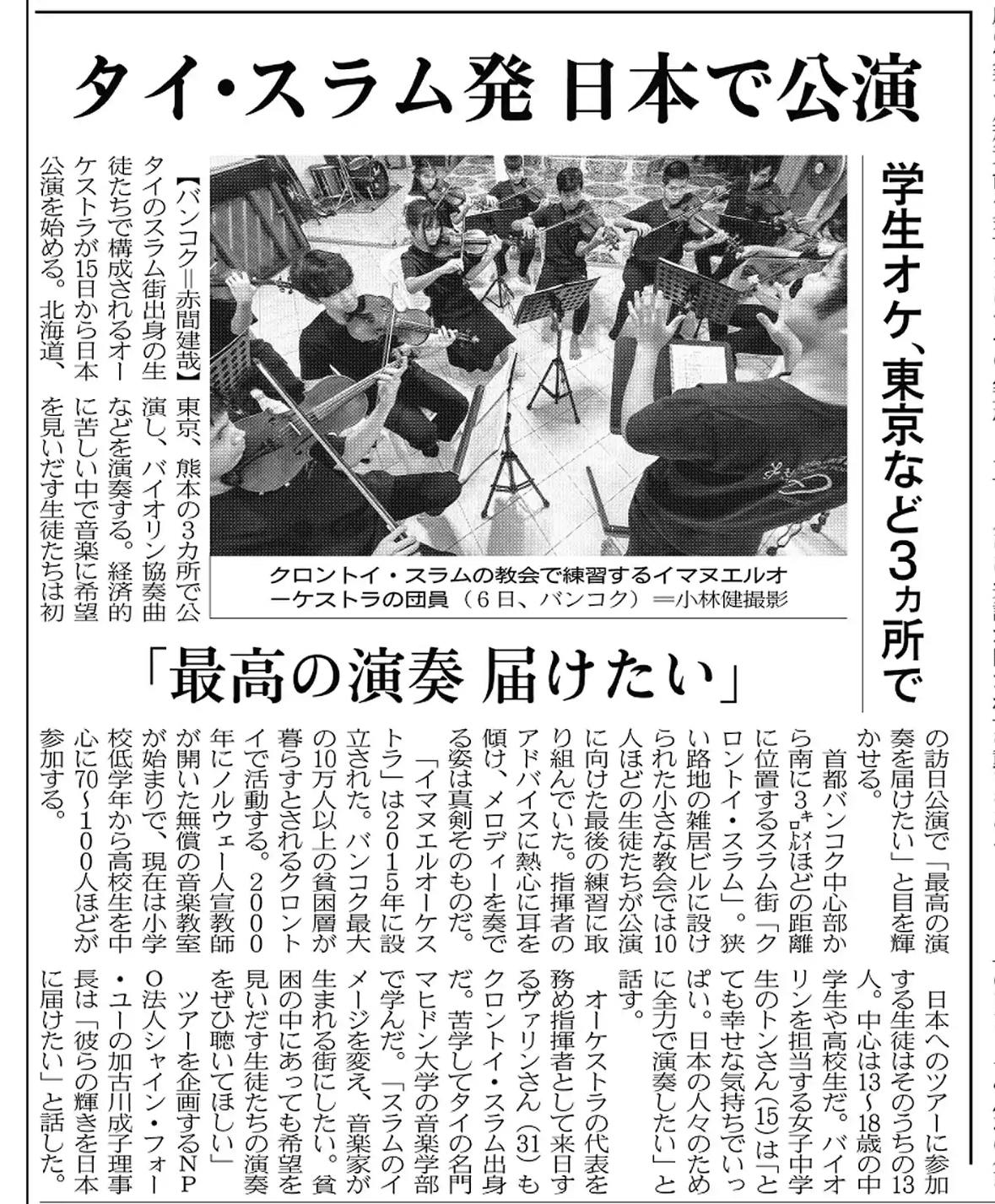 2023年10月13日付の日本経済新聞朝刊(社会面)でもイマヌエルオーケストラの来日公演への抱負が、クロントイ・スラムの紹介とともに取り上げられました。