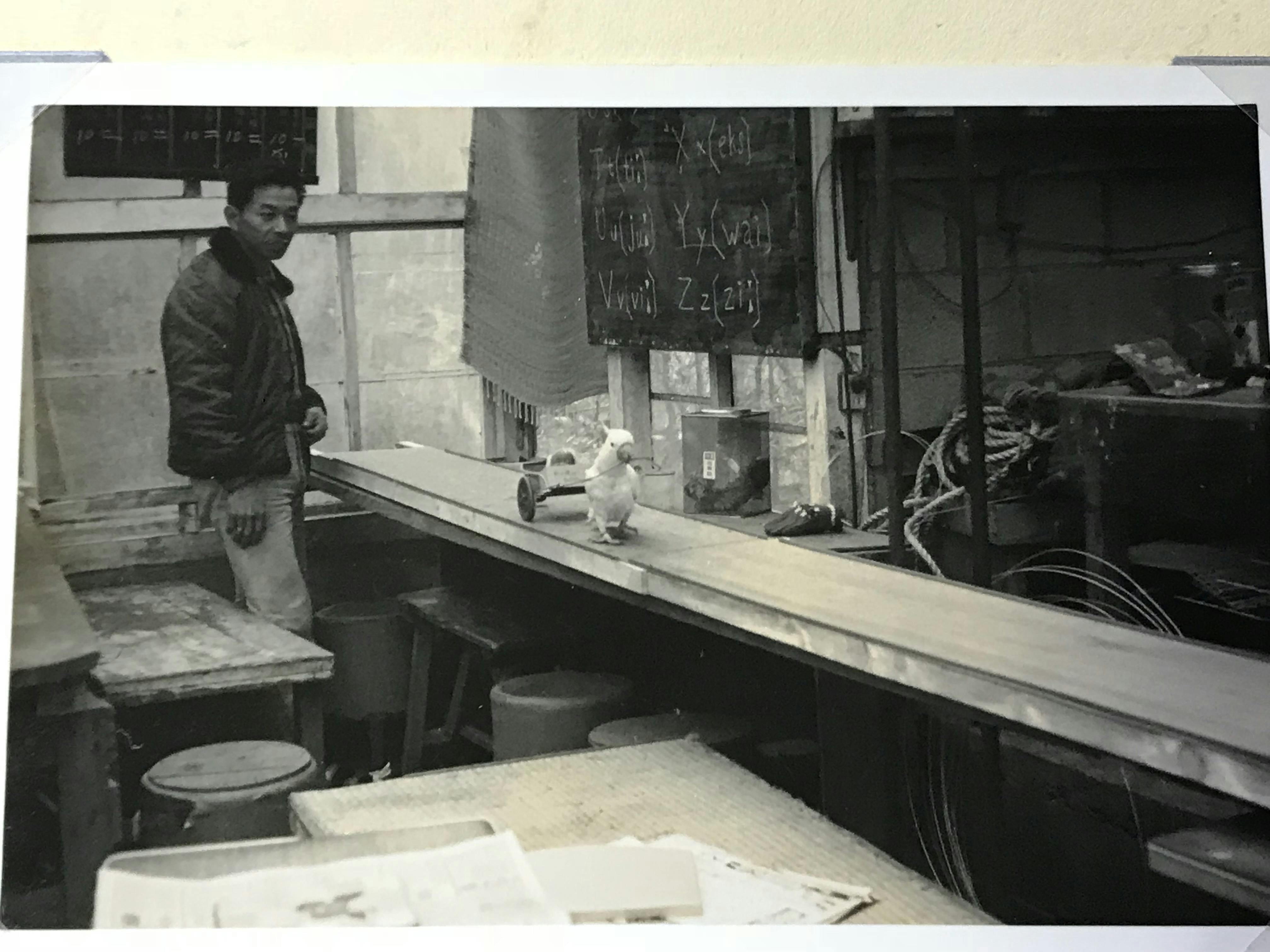 昭和52年 三代目 工房の前での写真。後ろに見えてる引き戸は今でも変わらずそのままです。