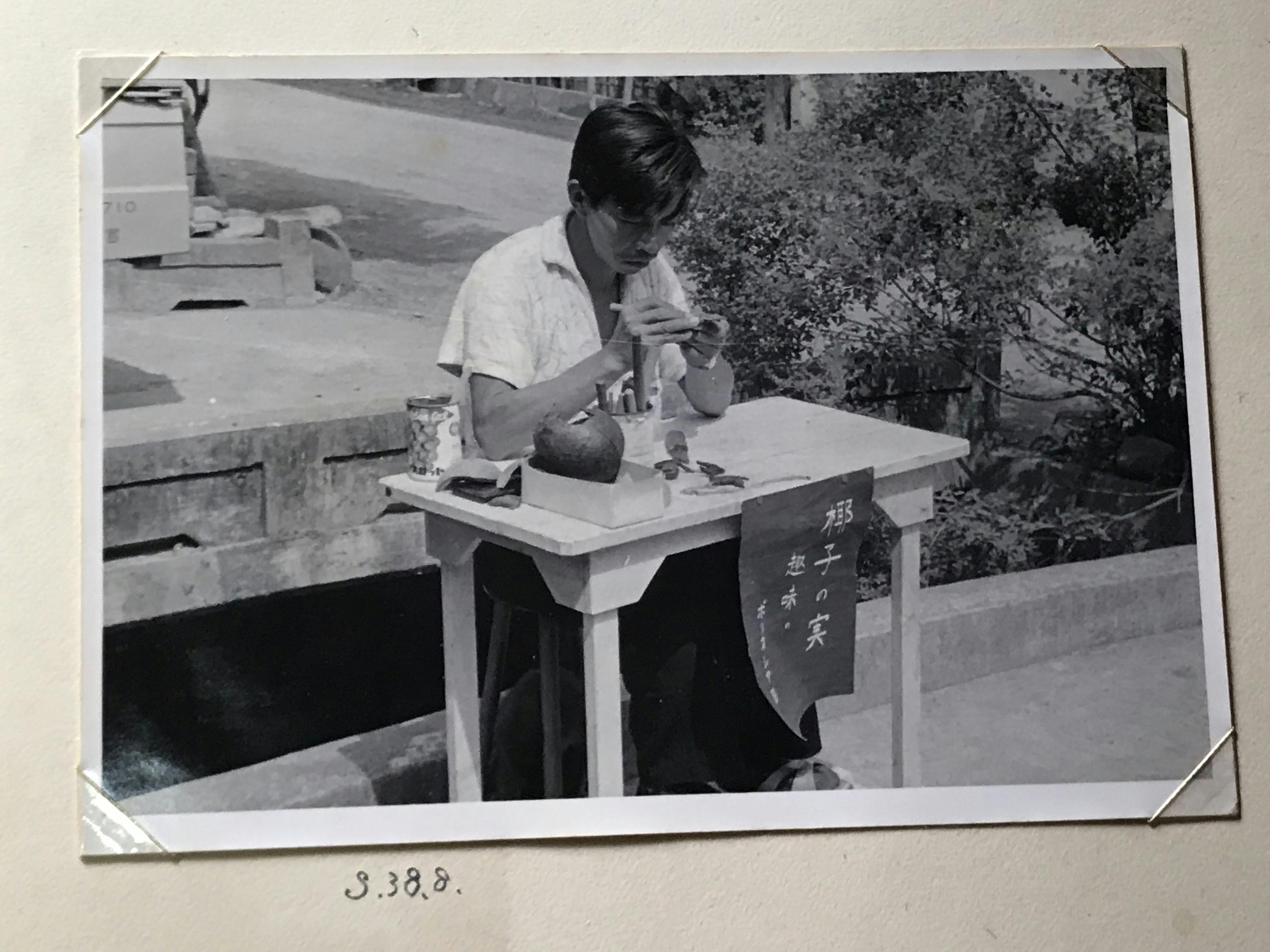 ↑↑↑修禅寺の境内前でヤシの実細工の実演をする父(辻󠄀 晨吾)