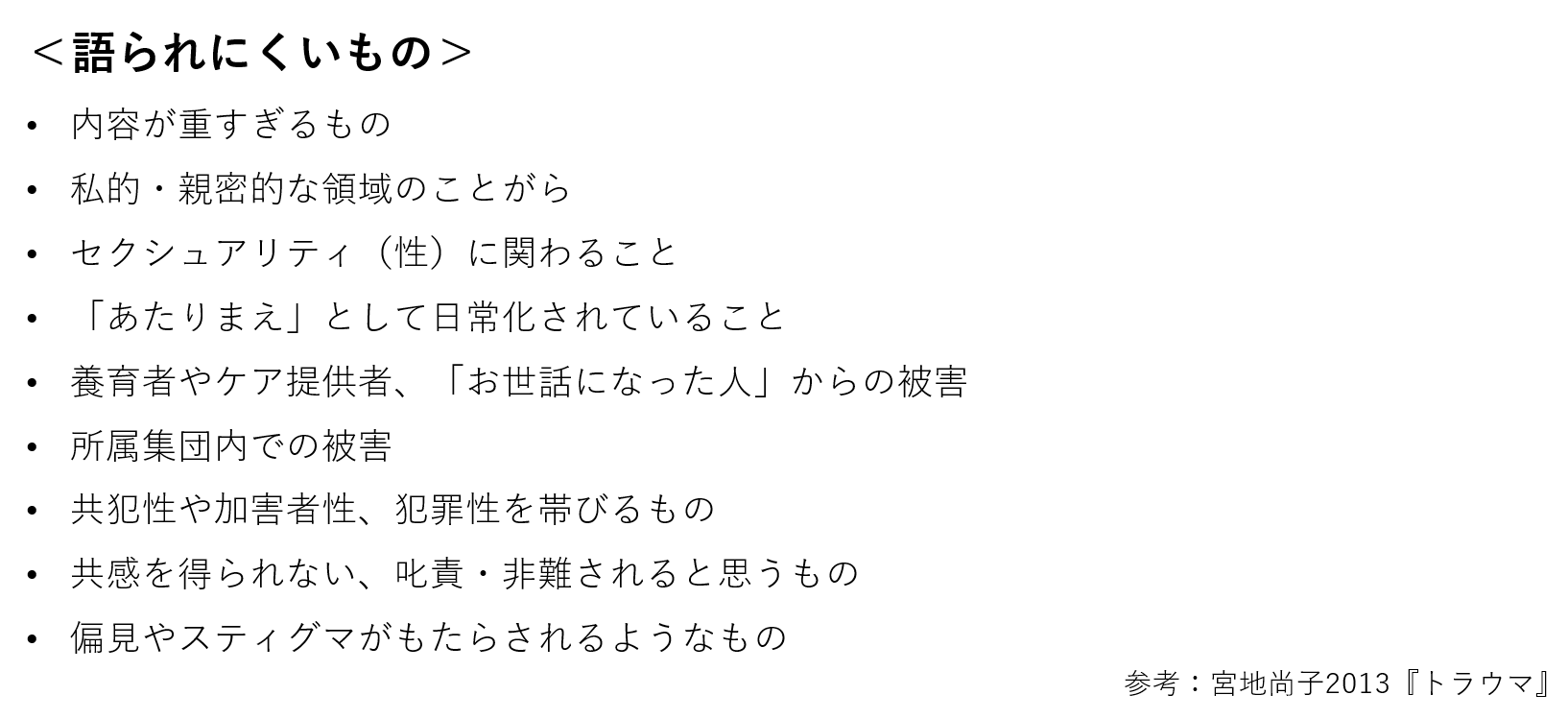 また、こうした体験はときに傷つき体験として“トラウマ”となり、語られにくいものとして知られています。