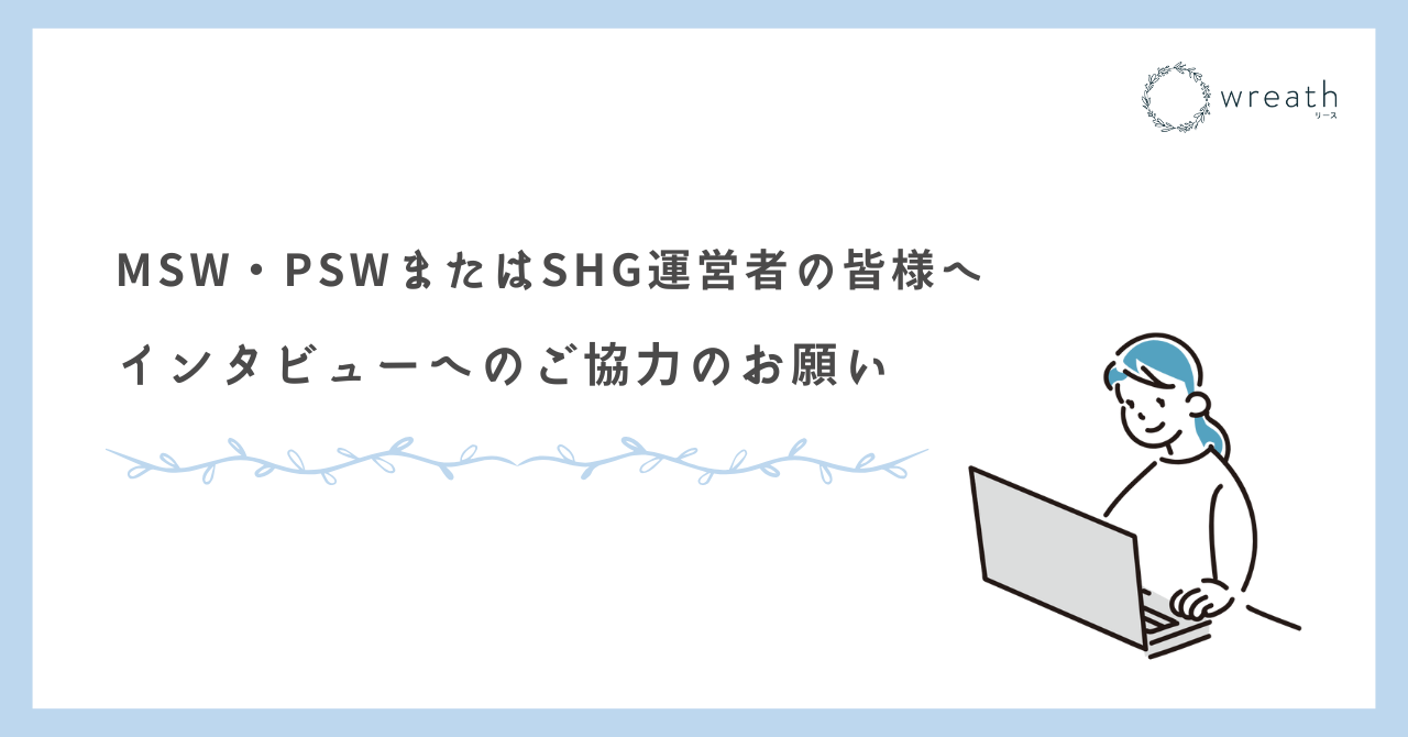 一般社団法人wreath(リース)です。「参加したい人と開催したい人をつなぐ セルフヘルプグループのプラットフォームづくり」のクラウドファンディングを応援いただきました皆様にお願いがありご連絡いたしました。現在、医療機関におけるセルフヘルプグループの情報提供の実態把握を目的とした調査を行なっており、インタビューにご協力いただける方を募集しております。■インタビュー対象者①または②に当てはまる方は、インタビューへのご協力のご検討をどうぞよろしくお願い申し上げます。①医療機関での勤務経験があるソーシャルワーカーの方条件:現在医療機関でソーシャルワーカーとして勤務している、または、過去に医療機関でソーシャルワーカーとして勤務したことがある方※患者さんまたはご家族にセルフヘルプグループの情報提供をしたことがあるかどうかは問いません②セルフヘルプグループを運営している方条件:グループの広報物を医療機関で配布または掲示いただけるように交渉したことがある、または、医療機関側から患者さんやご家族へのグループの紹介の相談を受けたことがある方※実際に広報物が配布または掲示されたかは問いません■インタビューの詳細・申込インタビューの詳細は下記noteをご覧いただけますと幸いです。ご協力いただける方は同ページにある申込フォームより申込をお願いいたします。ご協力いただけますと大変ありがたいです。>> https://note.com/wreath_pj/n/n1032582976d3…ー★ 近況のご報告 ★ー…あわせて近況のご報告ですが、昨年12月にセルフヘルプグループのプラットフォームへのミーティングのご投稿数が500件をこえました。よろしければ、これまでの歩みをまとめたレポートをご覧ください!>> https://note.com/wreath_pj/n/nbb5e85d06e60これからも「わたしだけじゃなかった」と思える社会にむけて活動を進めてまいります。今後ともどうぞよろしくお願いいたします。一般社団法人wreath 下村真代 もっと見る