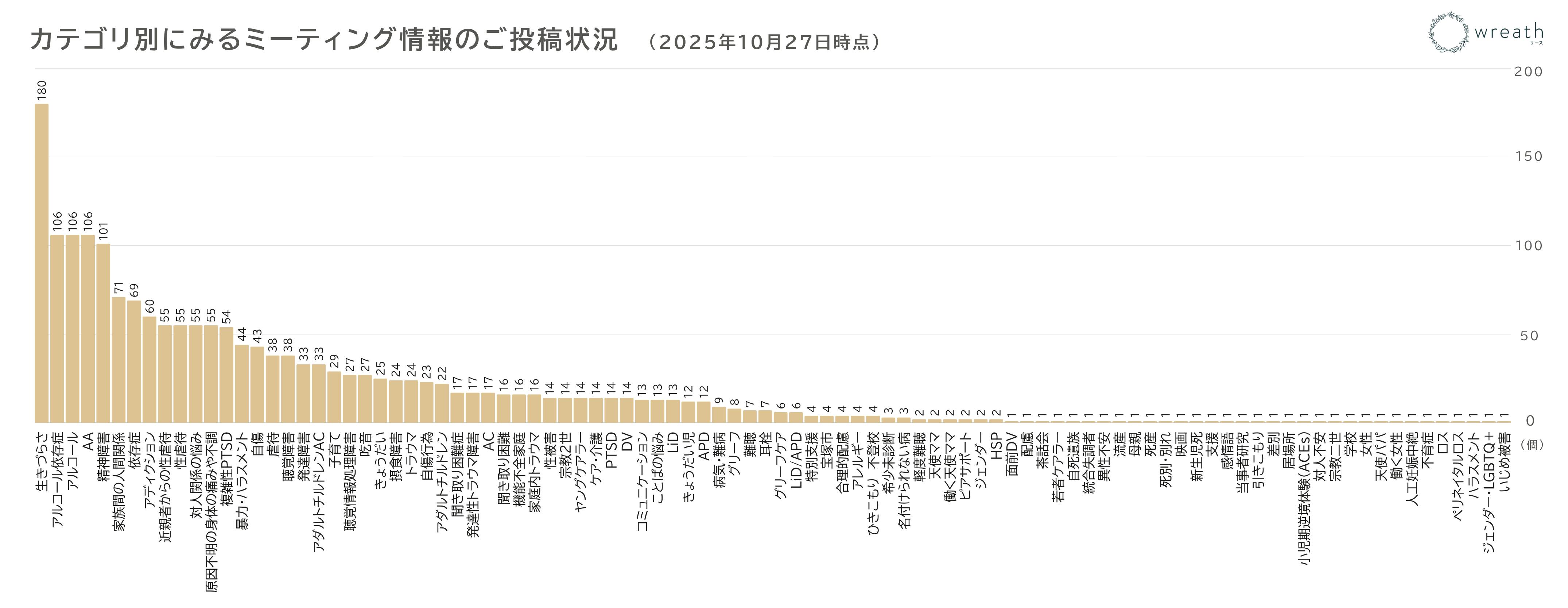 プレスリリースでは、セルフヘルプグループのプラットフォームへのミーティング情報のご投稿状況についても記載しております。ご投稿いただくミーティングの情報には、任意でカテゴリを設定していただいています。このたび、ご投稿いただいた438のミーティング情報にご設定いただいたカテゴリを集計し、グラフにまとめました。
