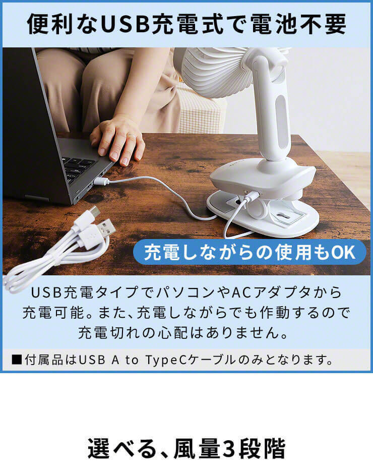 ・USB充電式なのでコードレスで使用できる!充電しながらも使用可能