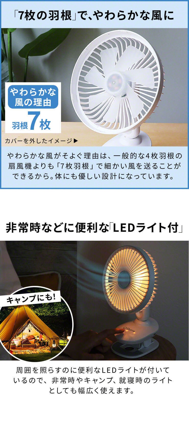 ・キャンプや就寝時にも便利なLEDライト付き