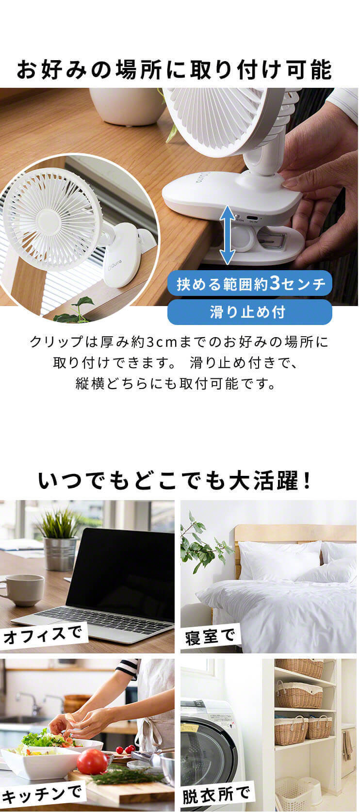 ・クリップ・スタンドの2wayで使える ※クリップで挟めるのは厚み約3cmまで