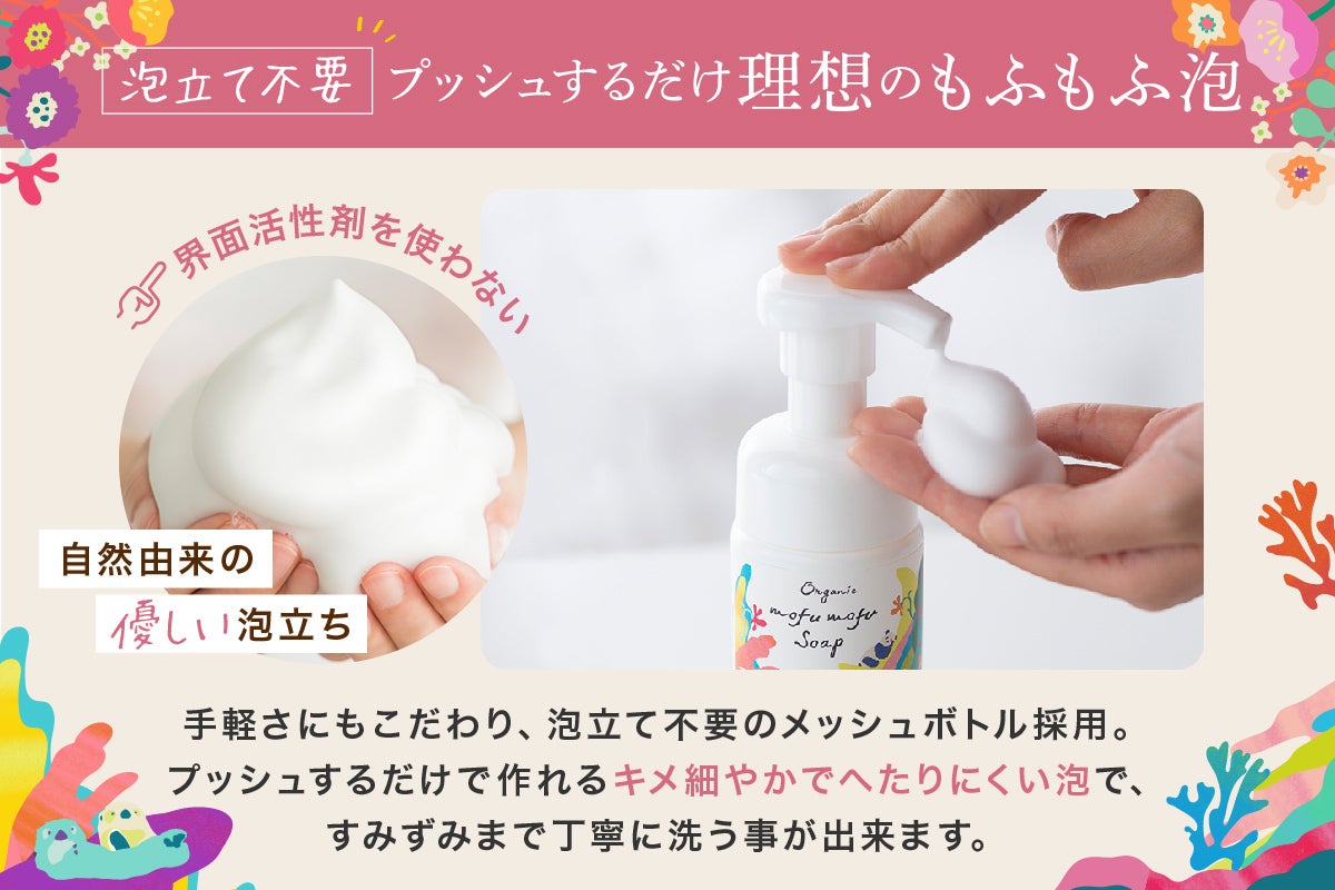 添加物に頼らずモフモフ泡を実現する為、メッシュ搭載のポンプフォーマーを採⽤しました。必要な潤いや皮脂を奪いすぎず、汚れだけを落とします。