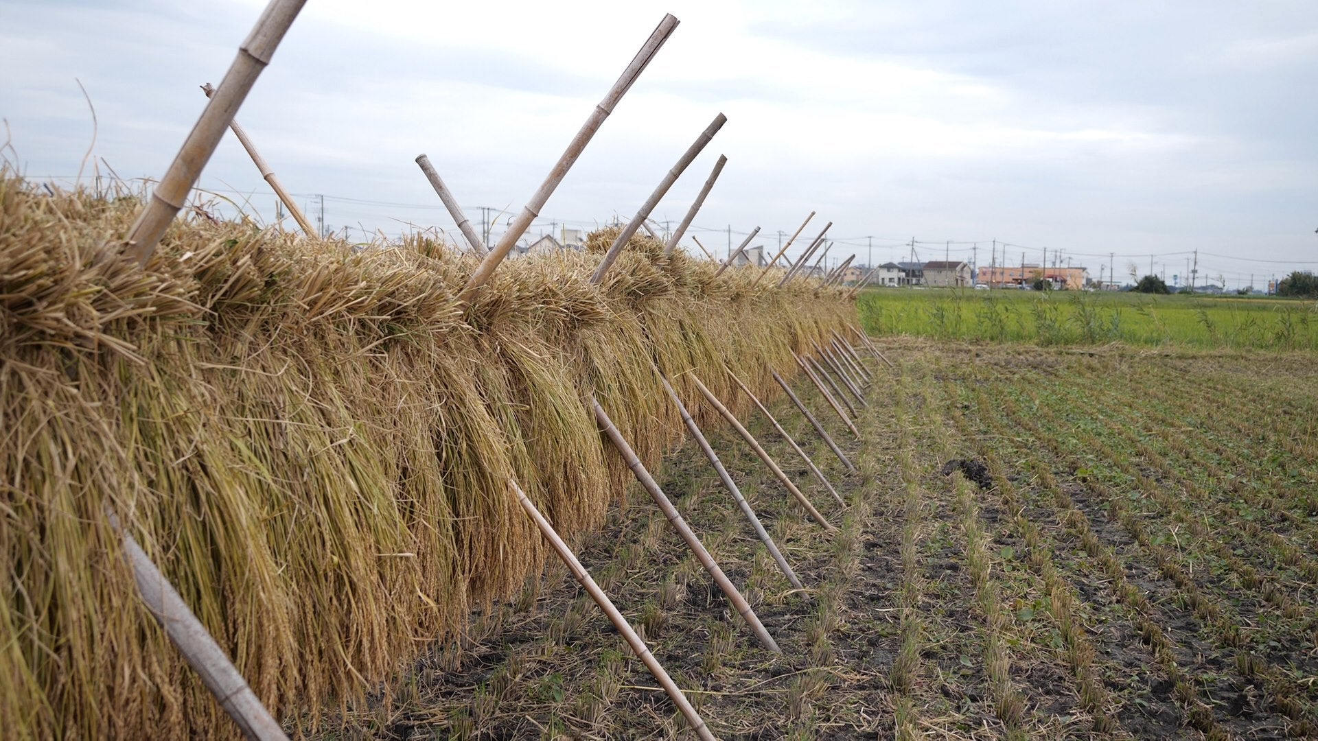 おだがけで乾燥する取手のお米。もっちりして甘くて美味しい自慢のお米です。