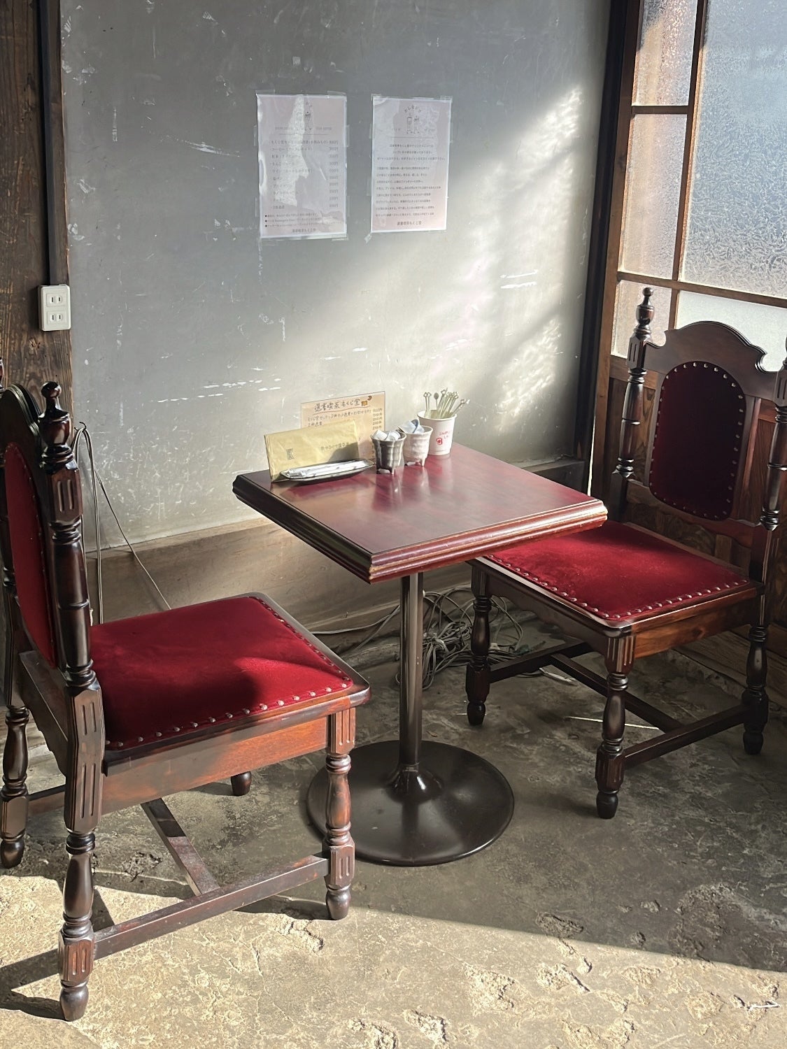 机や椅子(写真のもの。重厚感があり、昭和の喫茶店の雰囲気が味わえます)食器類など