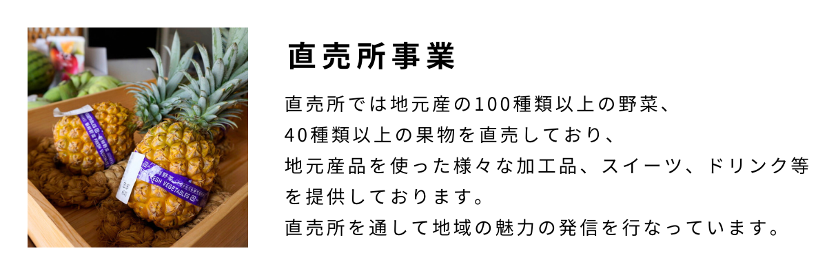 事業の大きな柱である直売所事業ではあたいぐゎー農家という小規模農家さんが中心になって沖縄独特の野菜、果物が出荷され、産品を生かした商品開発も行っていきました。地域の主力であるあたいぐゎー農家さんを支えることで地域の暮らしや風景を守ることに繋がっています。