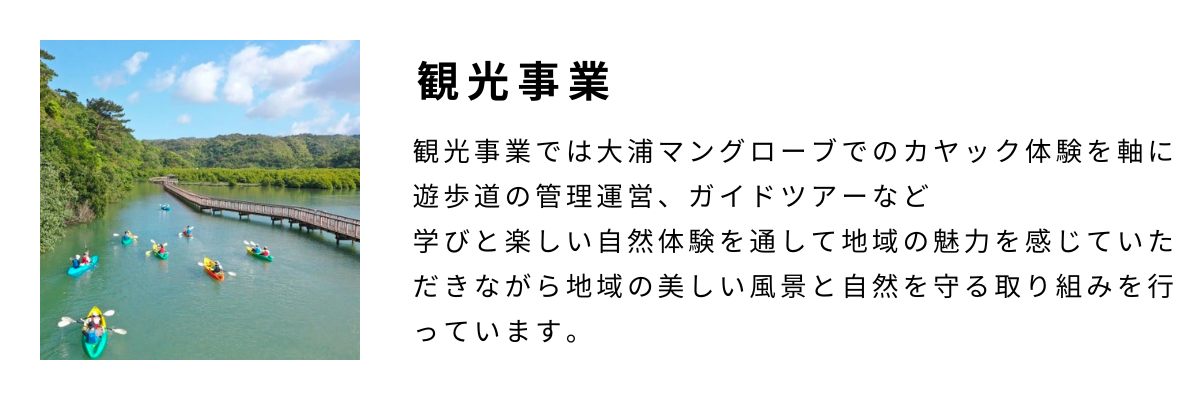 そのほかにも地域イベントやカヤック体験、大浦マングローブロードの運営、地元学校への食事提供、インターンやボランティア、外部人材の受入など人と人、人と地域がつながる活動を通して笑顔がわんさかあふれる場所を目指しています。
