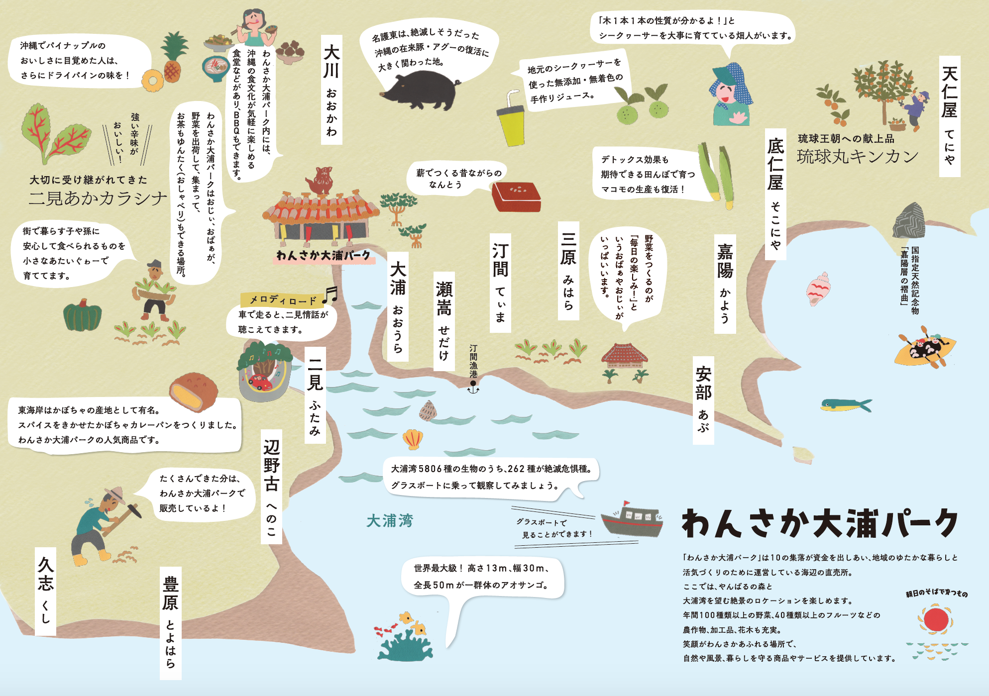 わんさか大浦パークは、沖縄名護東海岸地域のゆたかな暮らしと活気づくりのために地域おこしの拠点として、10の集落が資金を出しあい、郷土愛あふれる地域の人々の手によって立ち上がりました。