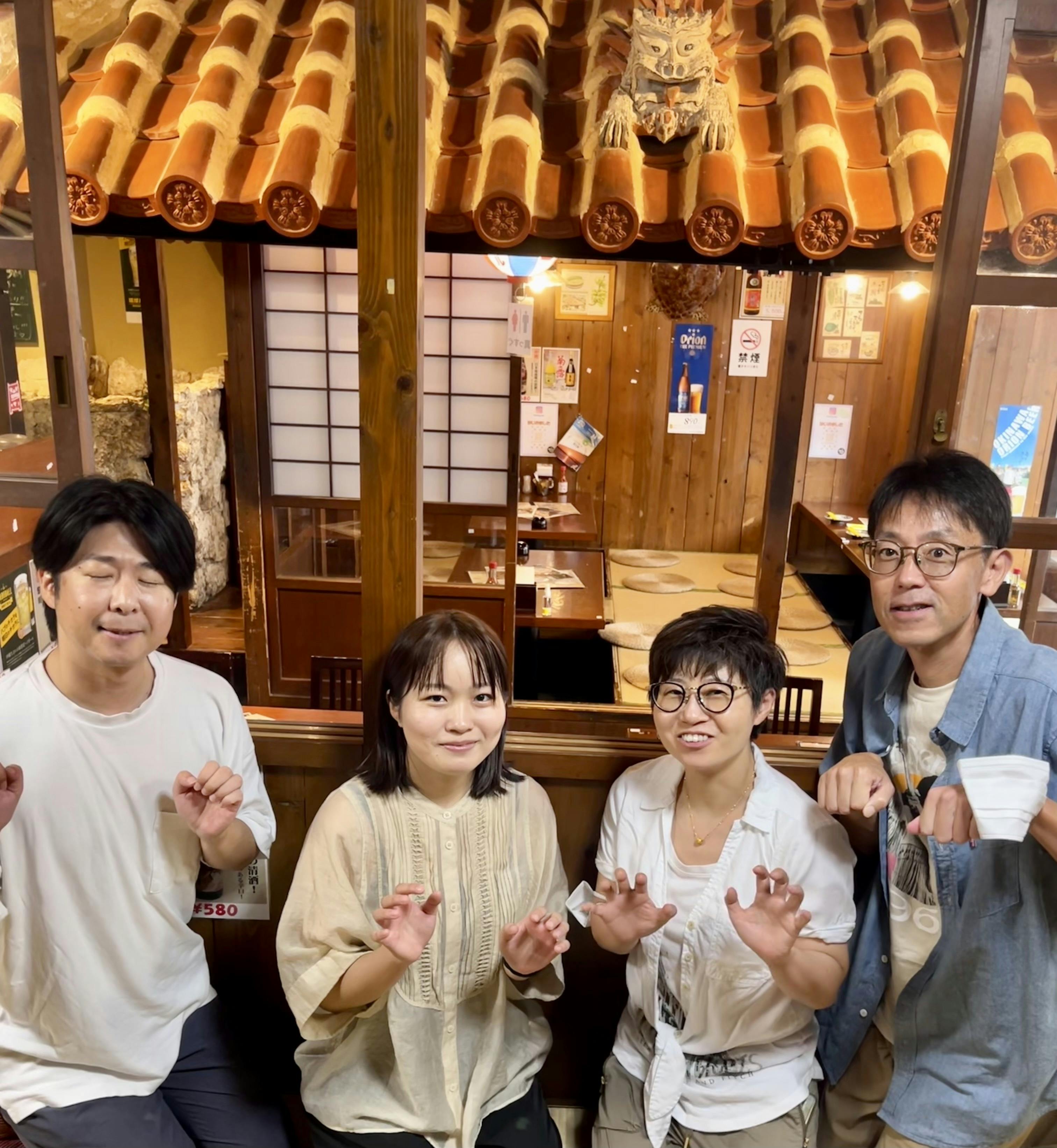 沖縄・名護東海岸の集落や暮らしと向き合う、深田さん・スタッフさんたちの想いや、地域の抱える課題を持続可能な形で解決に導く事業方針に共感し、今年6月から、多様なバックボーンを持つ4名が「わんさか大浦パーク」の活動に携わっています。※写真はシーサーを意識したポーズです。