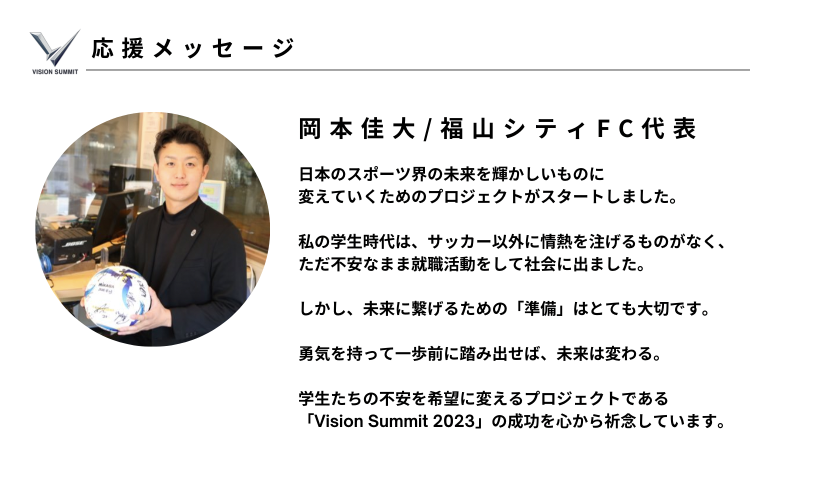 全国の競技に打ち込む体育会学生にとって、未来の一手となるようなイベント『Vision Summit 2023』を1000名規模で達成したいと思います。