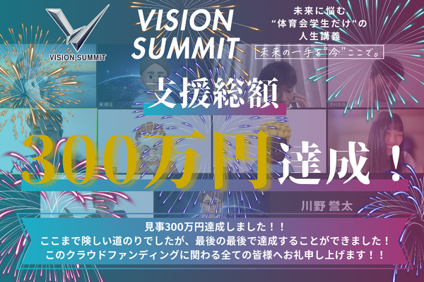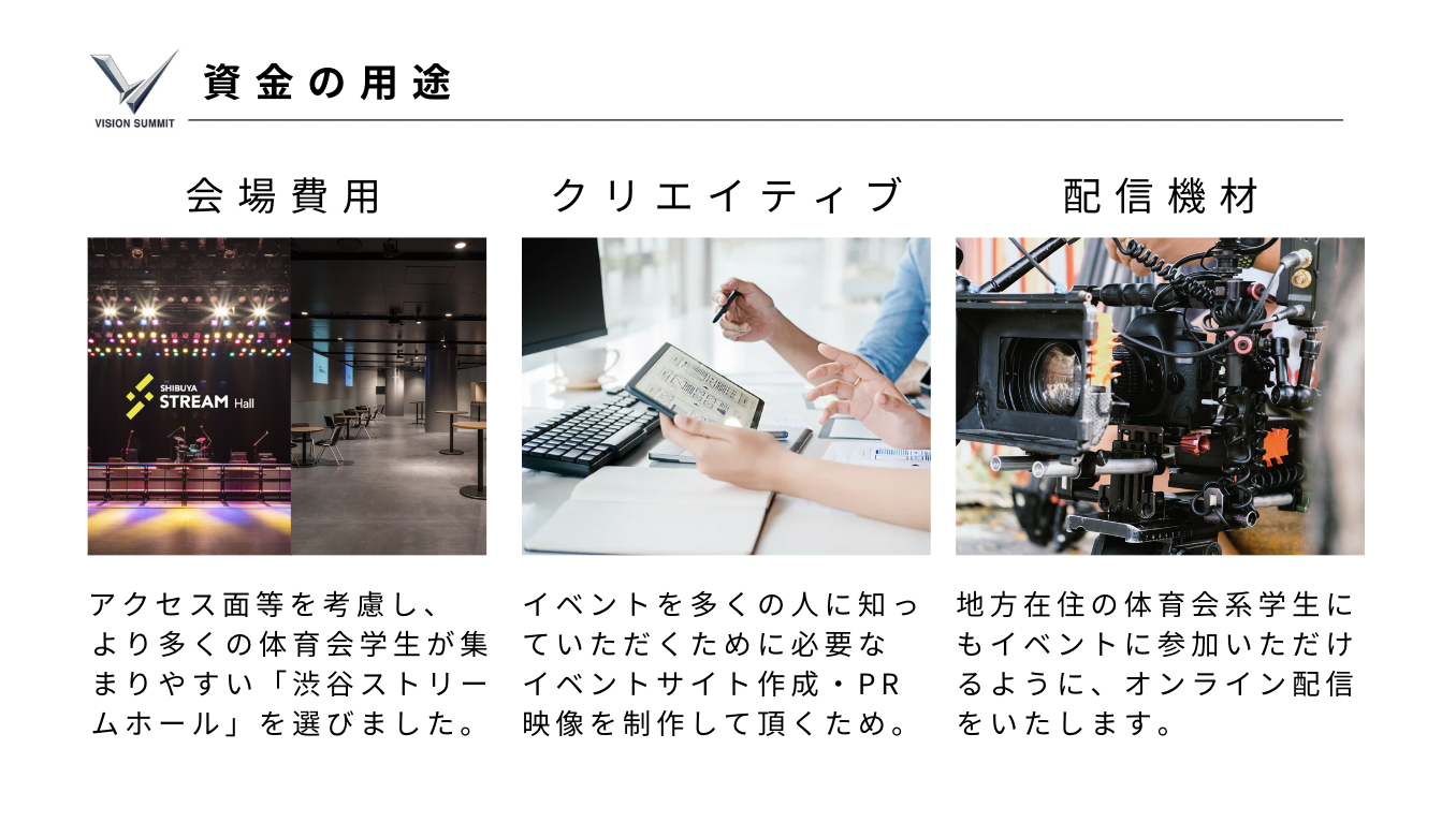 今回のVISIONサミットには、参加者全員の挑戦の火を燃やす力が必ずあります。これからの日本を担う大学生にとって大きなキッカケになるイベントにします。そんなイベントをより多くの人に届けるために、今回クラウドファンディングをすることに決めました。学生だけではこのイベントを大成功させることは簡単ではありません。私達の力だけでは足りない部分をクラウドファンディングを通して支援して頂き、共に体育会学生の在り方を変えるイベントを開催したいと思っています。