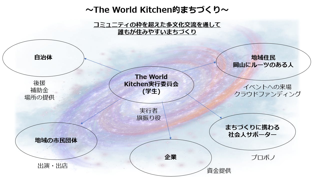 我々は、「岡山のまちに多文化交流の輪を広げ、誰もが住みやすいグローカルなまちづくりを推進したい」という想いから、多文化交流フードイベント The World Kitchenを企画・運営しています!