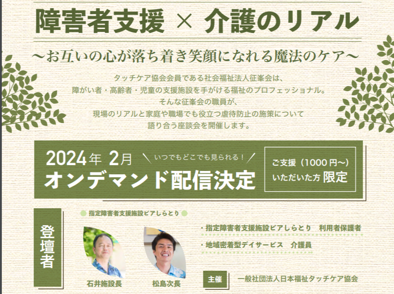 今回新たに令和6年2月に配信予定の「障害者支援×介護のリアル」というタッチケアを通してすでに実践者である管理者、支援者、保護者、高齢福祉従事者が語り合う座談会の視聴をクラウドファンディングご支援の返礼品に取り入れました。
