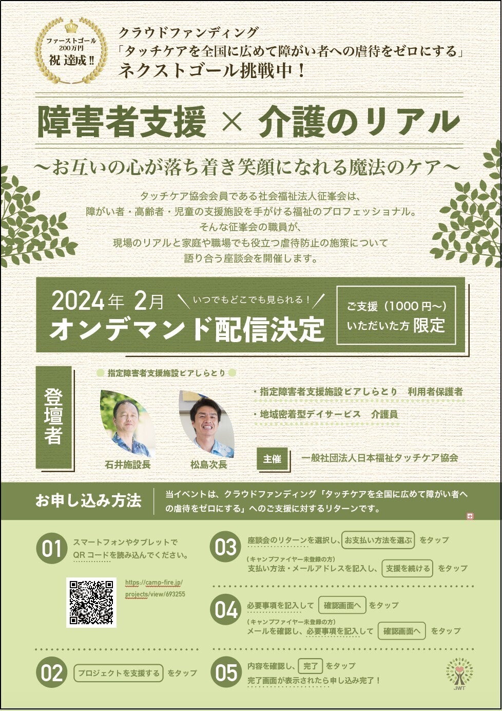 どうか多くの皆様に支援現場での実際の起こっていること、支援者、保護者の本音、タッチケアの効果をぜひとも聞いていただければと思います。