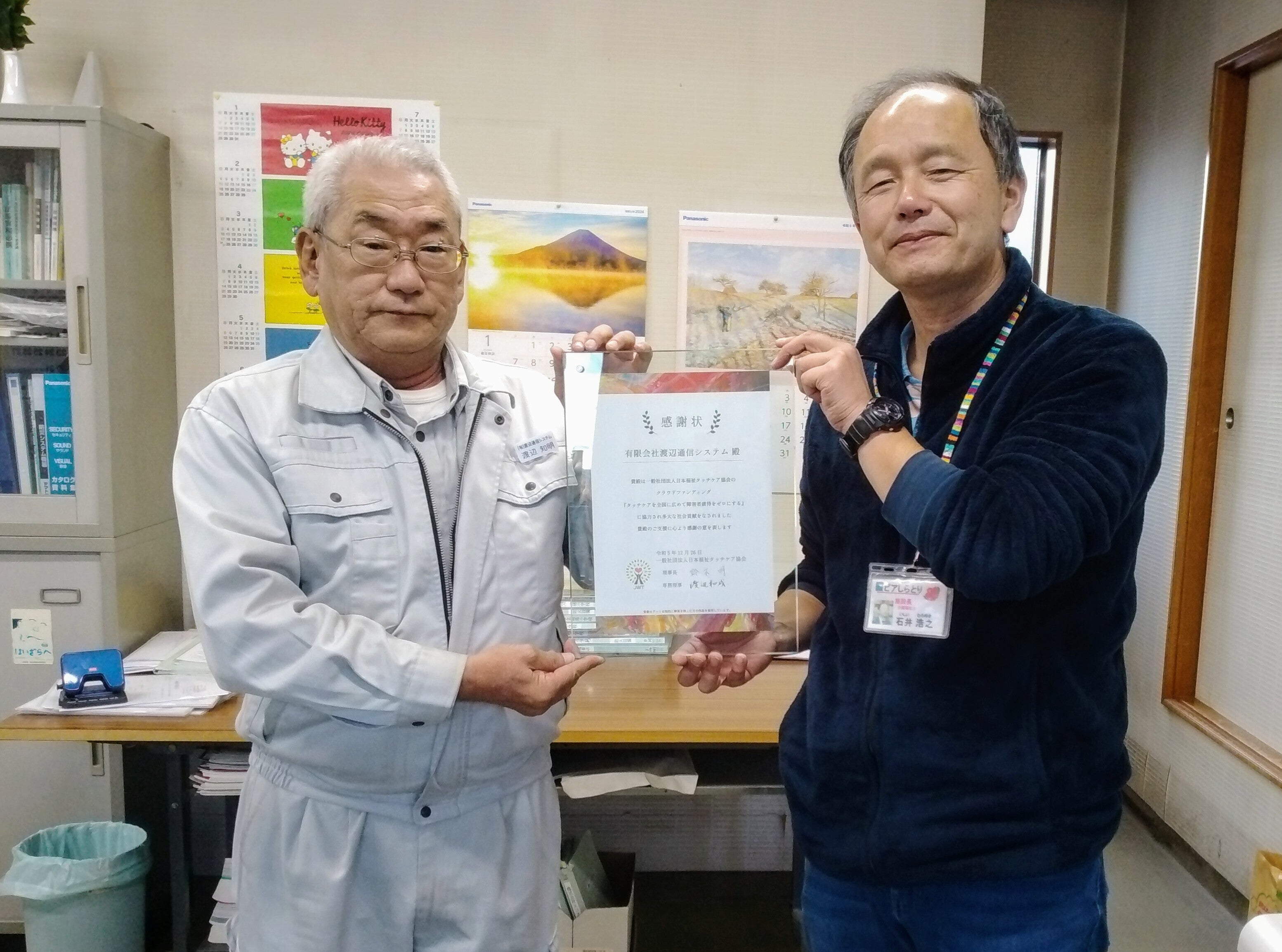 1月11日にはご支援いただきました企業様である、有限会社渡辺通信システム様を訪問し、代表取締役の渡辺知明様に感謝状を贈呈させていただきました。