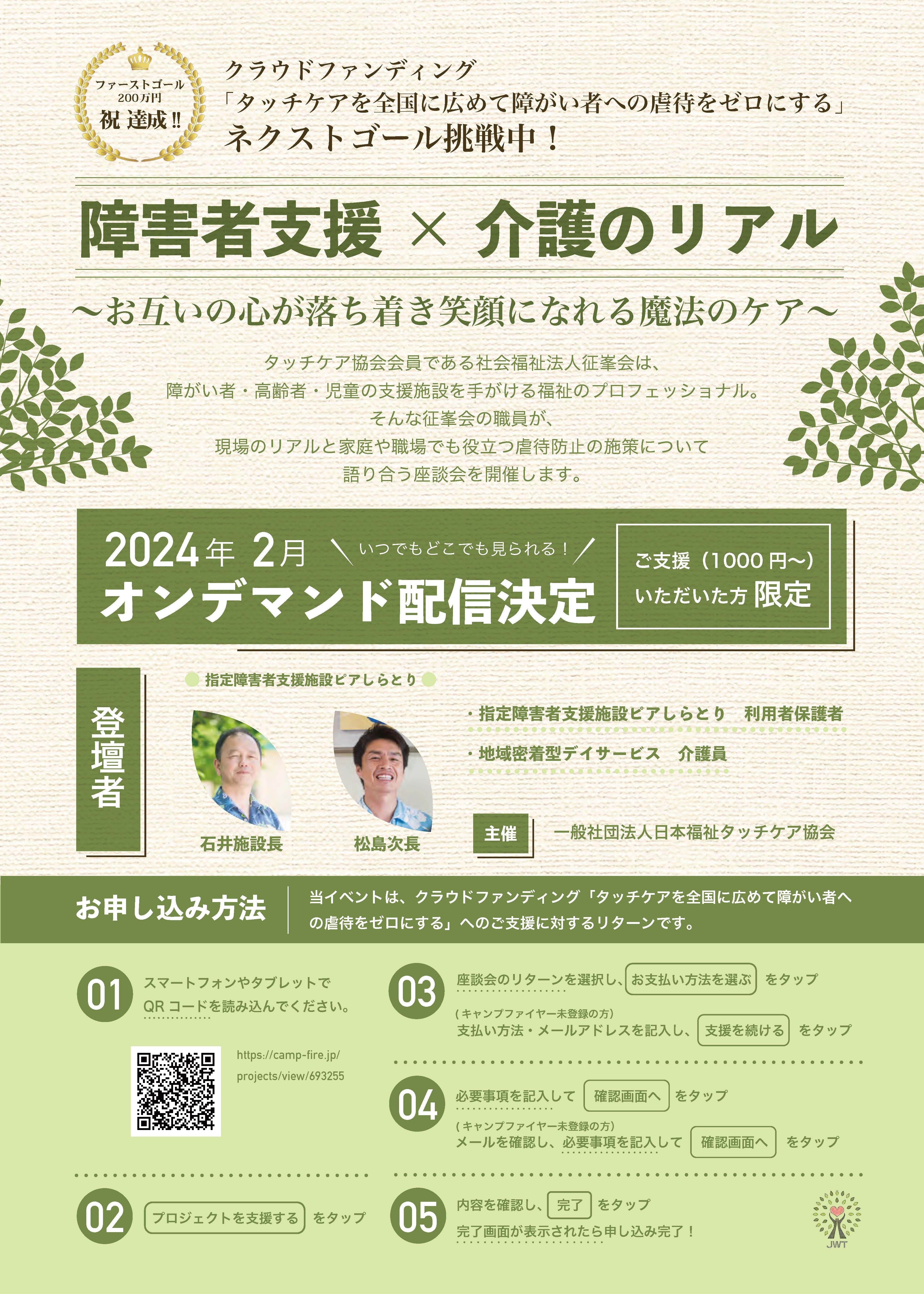 ネクストゴール300万を達成し、実行委員会でミーティングをしました。「私たちはなぜクラウドファンディングを始めたのか。」「タッチケアを全国に広めて虐待をゼロにしたいから」たくさんの人に知っていただくために、現場でどう活かしているか、どんな課題を感じているかを座談会のような形でリアル話のオンデマンド配信をやったらどうだろうか。それをリターンにしたい。試行錯誤を繰り返して、介護施設、障害者支援施設のスタッフさん、障害児を育てているお母さんにご依頼をして座談会を実施することができました。この様子を2024年2月~オンデマンド配信します。一人でも多くの方にタッチケアを知っていただきたいです。そして障害者虐待、高齢者虐待をゼロにして、誰もが輝く社会を実現したいです。このプロジェクトも残すところあと5日。皆様よろしくお願いいたします。