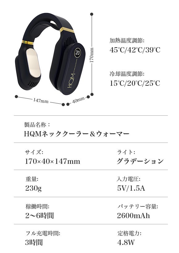 これまでの類似製品と異なり、HQMネッククーラー&ウォーマーは両手が空くので、荷物を持って移動する時やウォーキングなど運動の時に便利です。また冷却と加熱ができますので四季を問わず使用可能。さらに低騒音設計ですので、より快適にお使いいただけます。
