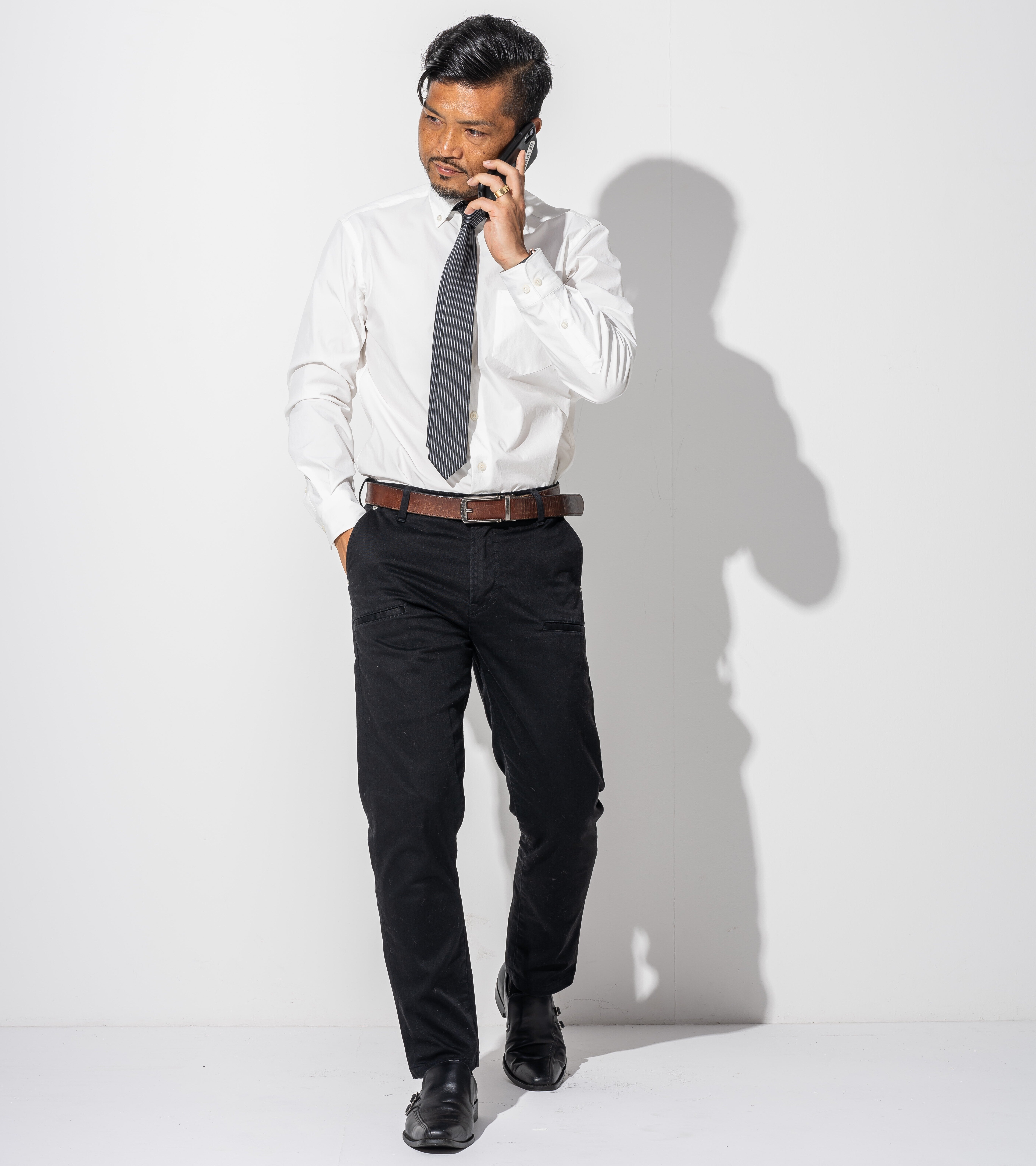 オン・オフ関係なく勝負所のシャツも白シャツですよ。