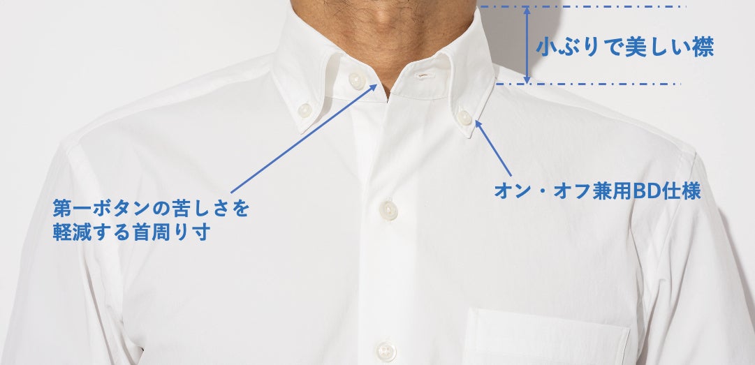 ビジネスでもカジュアルでも使える様にTPOを気にしないデザインを用いて、白シャツの大敵である汚れ を完全解決しました。