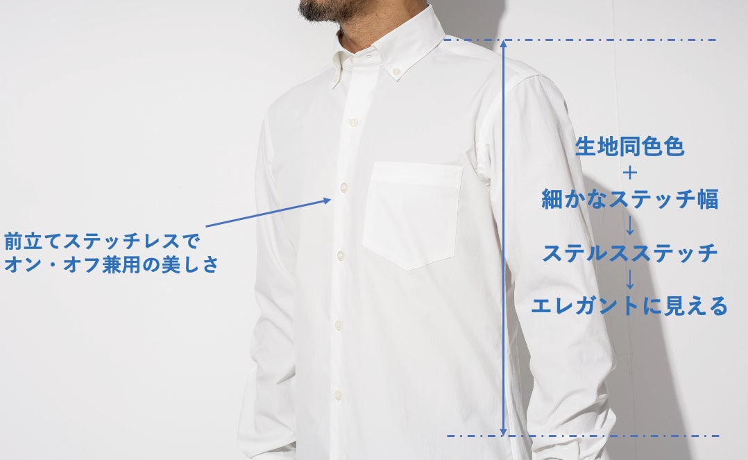 実は、ドレスシャツをベースにオンオフ兼用できる独自デザインになているんです。