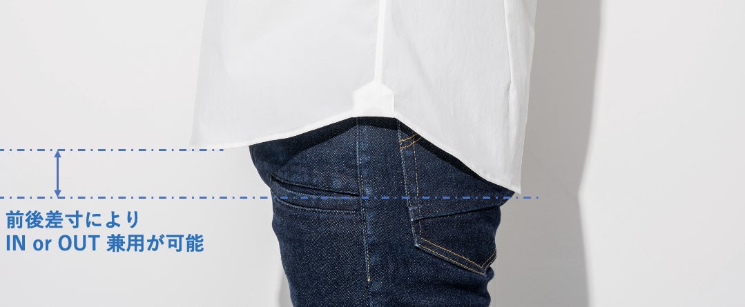裾の長さは、ビジネスにもカジュアルにも使える絶妙な長さになっています。ビジネス用シャツって裾長過ぎですからね(汗)カジュアル用に使うには丈の長さの限界があります。オン・オフ兼用の裾の長さの均衡点で設定しているので使いやすいと思いますよ!
