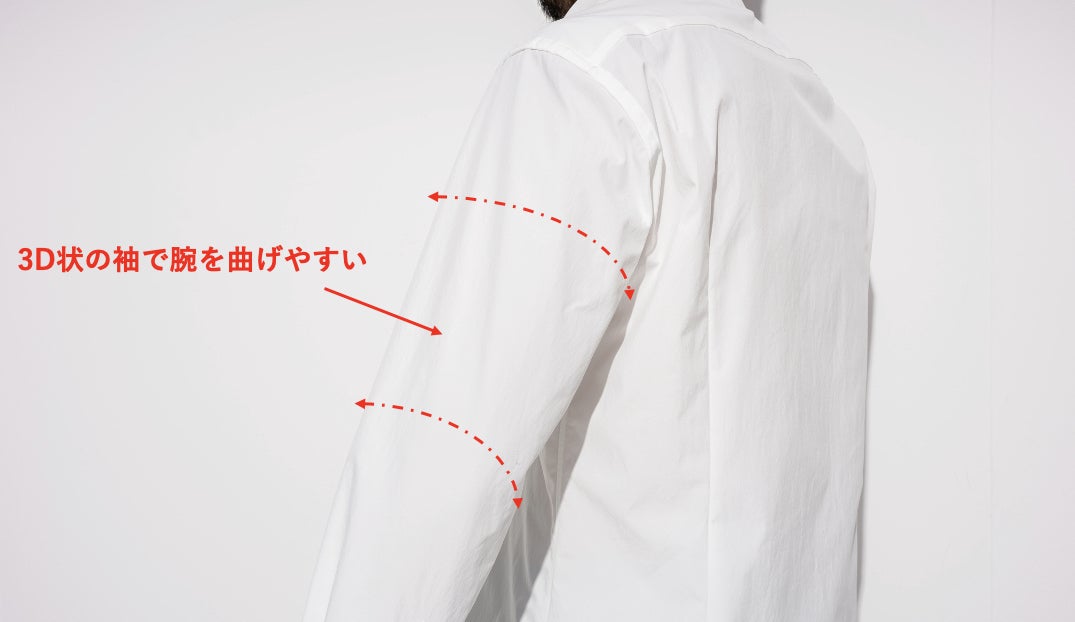 白シャツの腕って動かしにくいですよね。それはなぜか?人間の腕は3Dです。そこに対して平面の袖を用いるから突っ張って動きにくいんです!