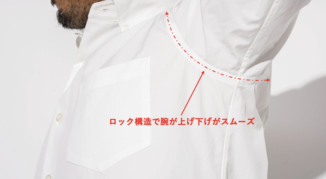 パリッとしたスマートなシャツなのに、サクサク腕を上げ下ろしできますよ(笑)