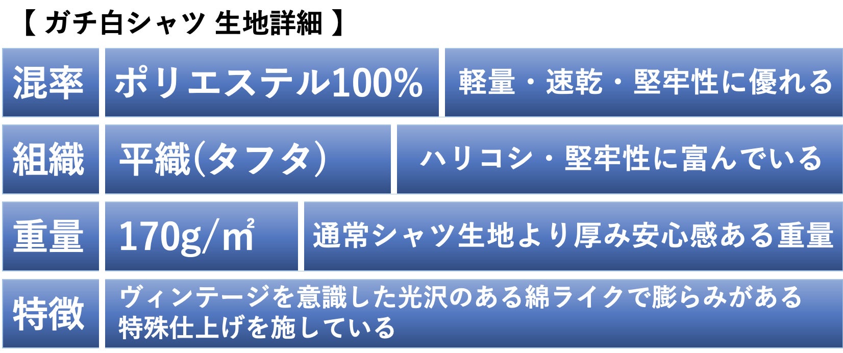 今回使用の生地は、170g/㎡の平織生地を採用しています。これは耐久性向上を目的としつつ、シワになりにくく透けにくい機能を有する為です。先出ではおちゃらけてしまいましたが・・・実は白シャツのデメリットを極限まで削る為に考えに考え抜いた生地なんです(実は俺って熱い開発者なんです)。