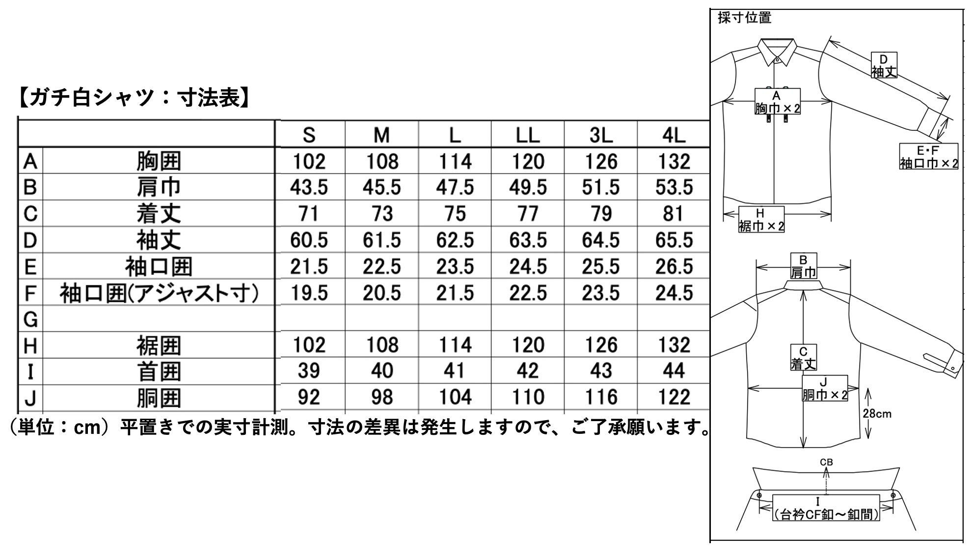 -着用ガチ白シャツ:Mサイズ(首囲40cm / 胸囲108cm / 肩幅45.5cm / 袖丈61.5cm / 胴囲98cm)