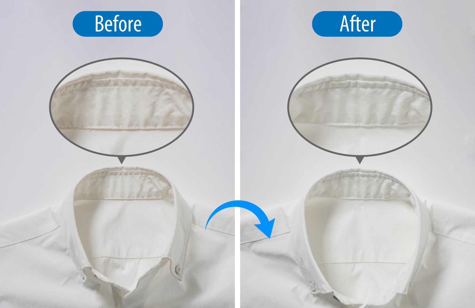 白シャツを破棄する一番の要因は、着用での皮脂汚れの蓄積ですよね。首元・袖口が汚くなります・・・でも大丈夫です!